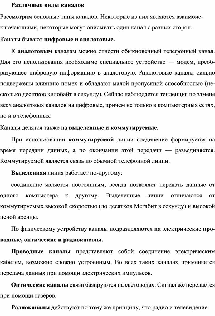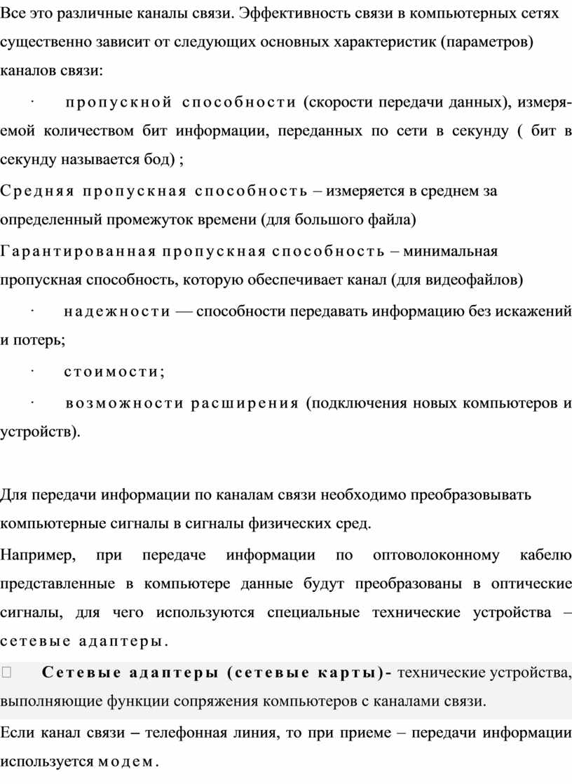 Все это различные каналы связи. Эффективность связи в компьютерных сетях существенно зависит от следующих основных характеристик (параметров) каналов связи: