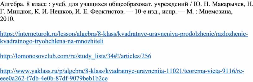 Алгебра. 8 класс : учеб. для учащихся общеобразоват. учреждений / Ю. Н. Макарычев, Н. Г. Миндюк, К. И. Нешков, И. Е. Феоктистов. — 10-е изд., испр. — М. : Мнемозина,