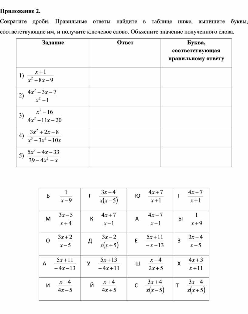 Сократите дроби. Правильные ответы найдите в таблице ниже, выпишите буквы, соответствующие им, и получите ключевое слово. Объясните значение полученного слова.