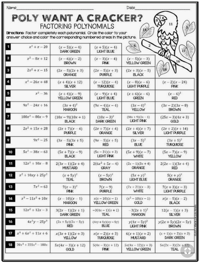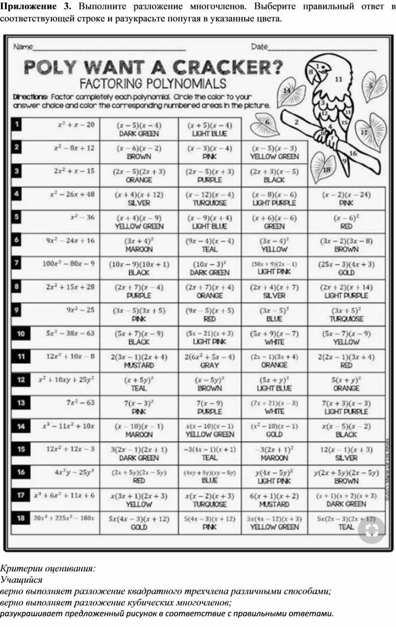 Приложение 3. Выполните разложение многочленов. Выберите правильный ответ в соответствующей строке и разукрасьте попугая в указанные цвета.