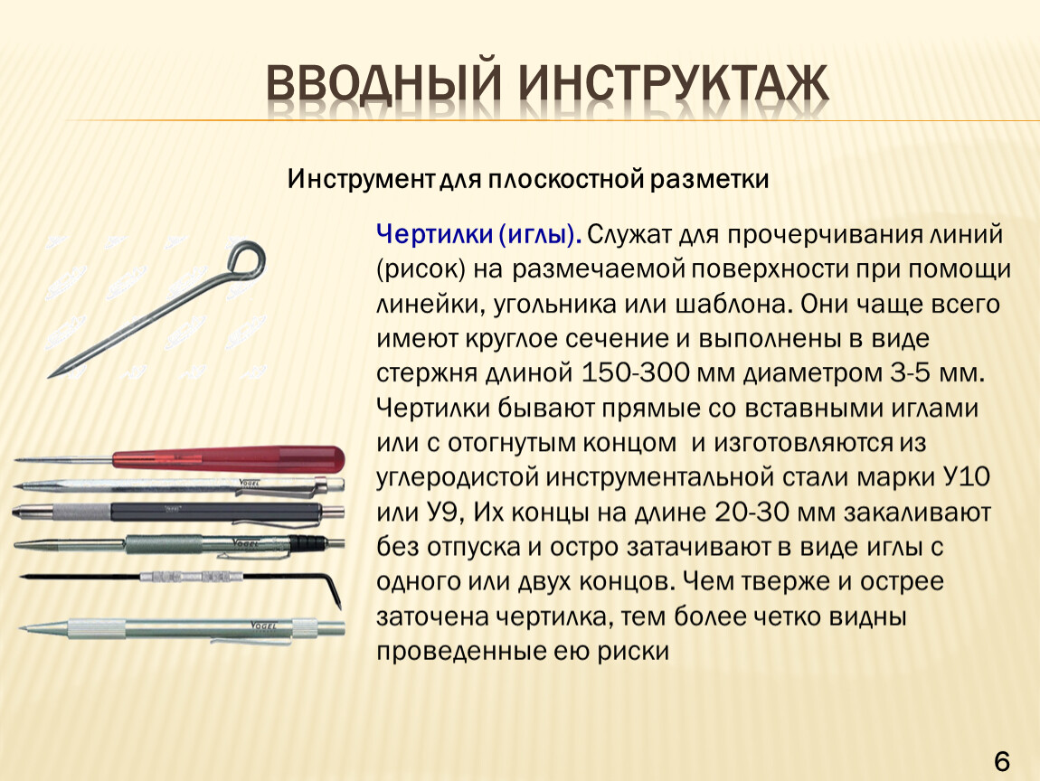 Чертилки (иглы). Служат для прочерчивания линий (рисок) на размечаемой поверхности при помощи линейки, угольника или шаблона. Они чаще всего имеют круглое сечение и выполнены в виде стержня длиной 150-300 мм диаметром 3-5 мм.