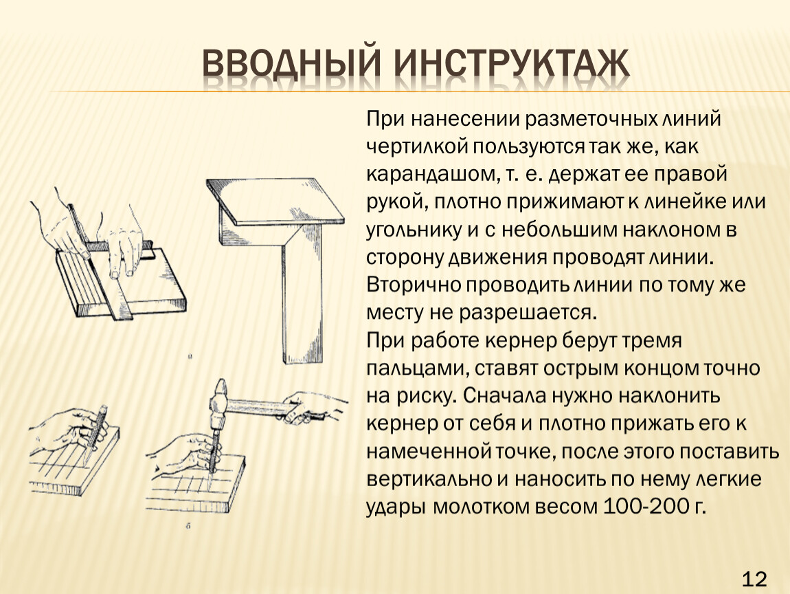 При нанесении разметочных линий чертилкой пользуются так же, как карандашом, т. е. держат ее правой рукой, плотно прижимают к линейке или угольнику и с небольшим наклоном в сторону движения проводят линии. Вторично проводить линии по тому же месту не разрешается.