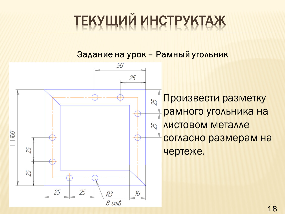 Произвести разметку рамного угольника на листовом металле согласно размерам на чертеже.