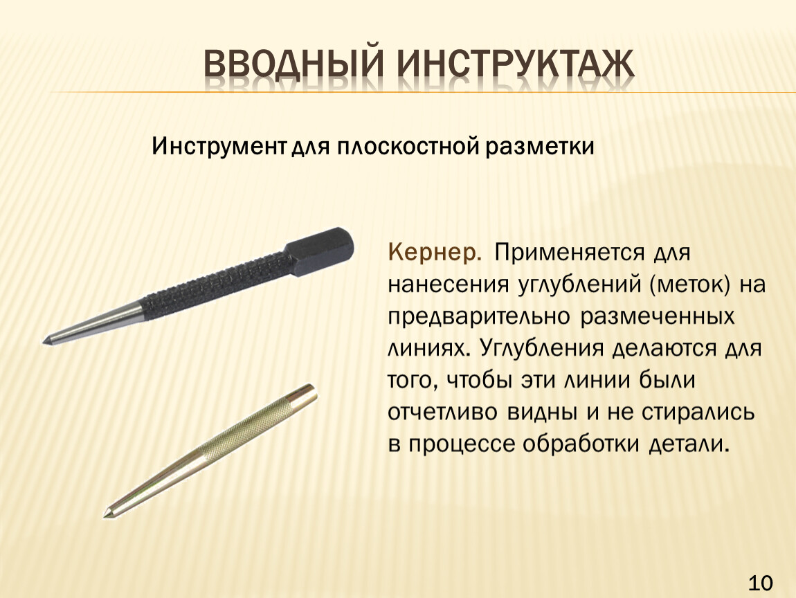 Кернер. Применяется для нанесения углублений (меток) на предварительно размеченных линиях. Углубления делаются для того, чтобы эти линии были отчетливо видны и не стирались в процессе обработки детали.