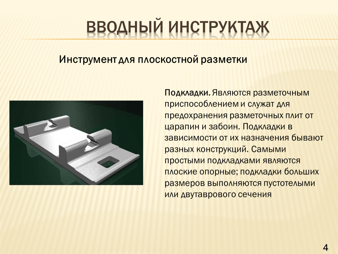 Подкладки. Являются разметочным приспособлением и служат для предохранения разметочных плит от царапин и забоин. Подкладки в зависимости от их назначения бывают разных конструкций. Самыми простыми подкладками являются плоские опорные; подкладки больших размеров выполняются пустотелыми или двутаврового сечения