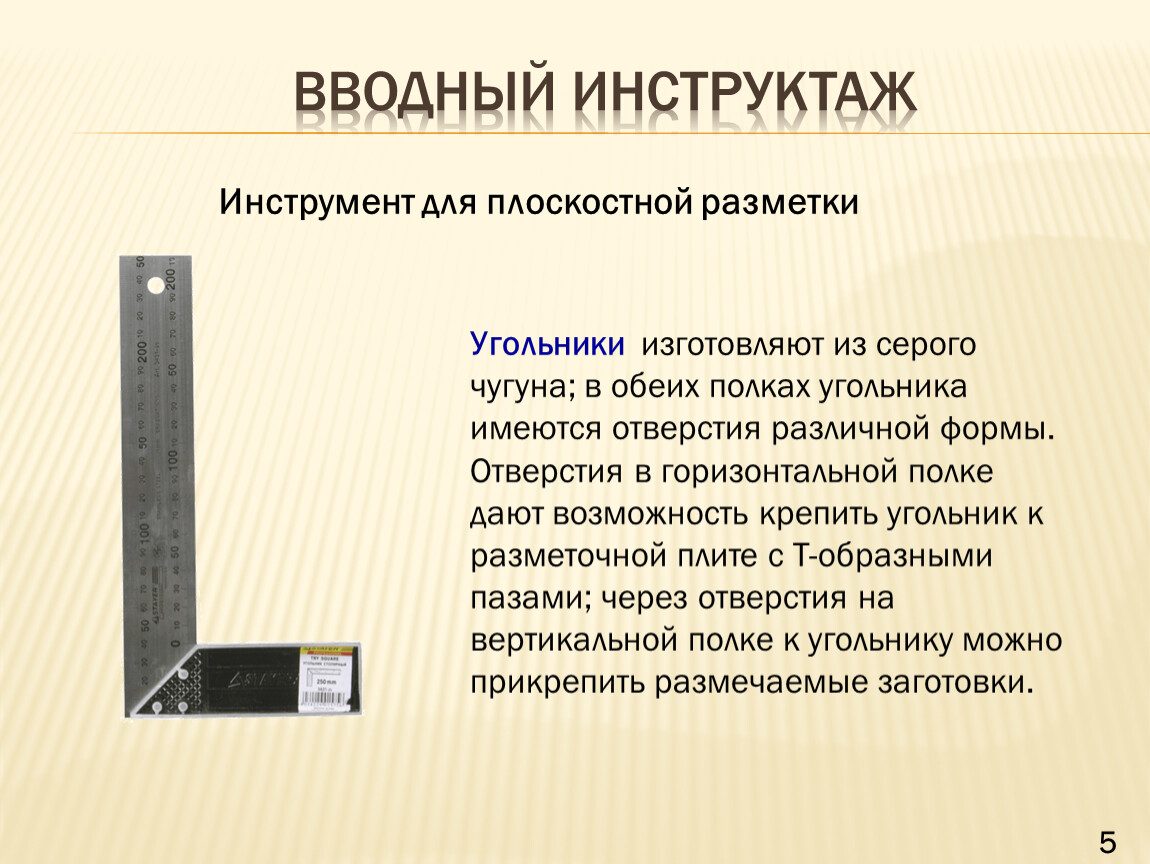 Угольники изготовляют из серого чугуна; в обеих полках угольника имеются отверстия различной формы. Отверстия в горизонтальной полке дают возможность крепить угольник к разметочной плите с Т-образными пазами; через отверстия на вертикальной полке к угольнику можно прикрепить размечаемые заготовки.