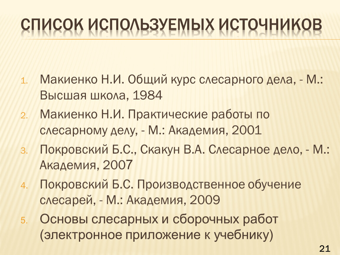 Макиенко Н.И. Общий курс слесарного дела, - М.: Высшая школа, 1984