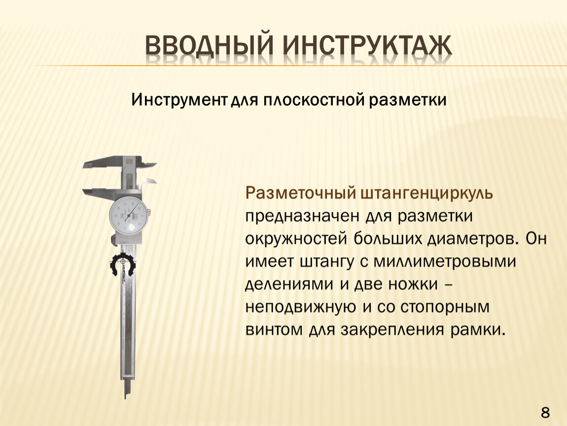 Разметочный штангенциркуль предназначен для разметки окружностей больших диаметров. Он имеет штангу с миллиметровыми делениями и две ножки – неподвижную и со стопорным винтом для закрепления рамки.