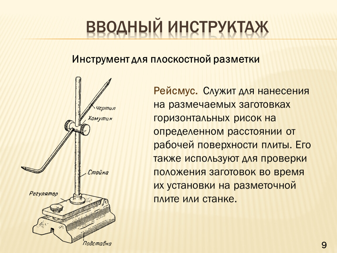 Рейсмус. Служит для нанесения на размечаемых заготовках горизонтальных рисок на определенном расстоянии от рабочей поверхности плиты. Его также используют для проверки положения заготовок во время их установки на разметочной плите или станке.