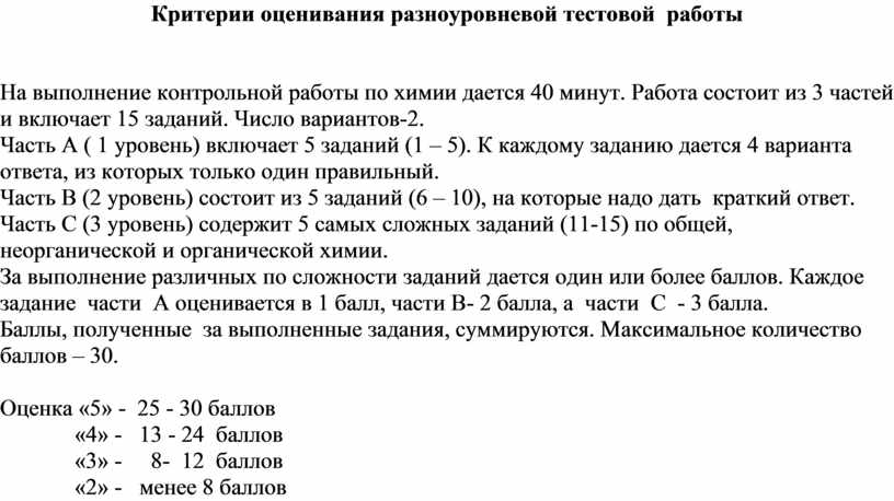 На выполнение контрольной работы по химии дается 40 минут. Работа состоит из 3 частей и включает 15 заданий. Число вариантов-2.
