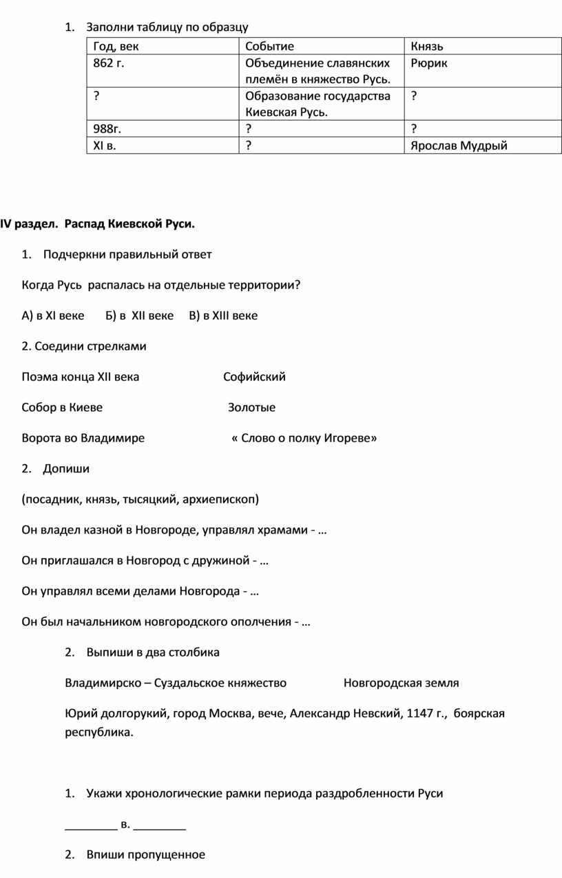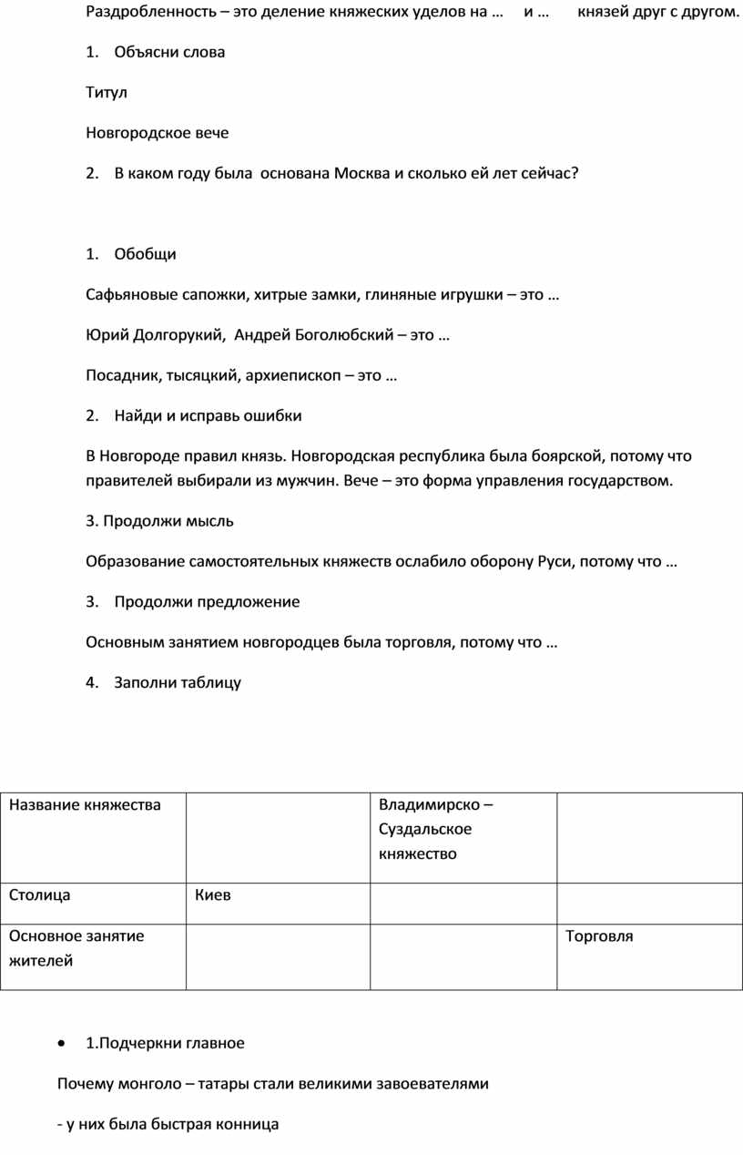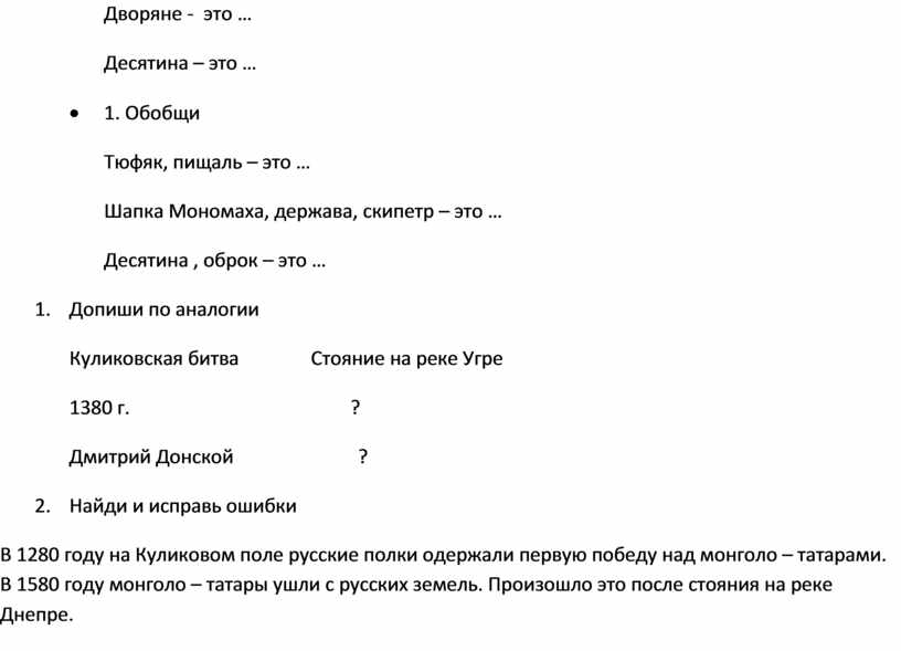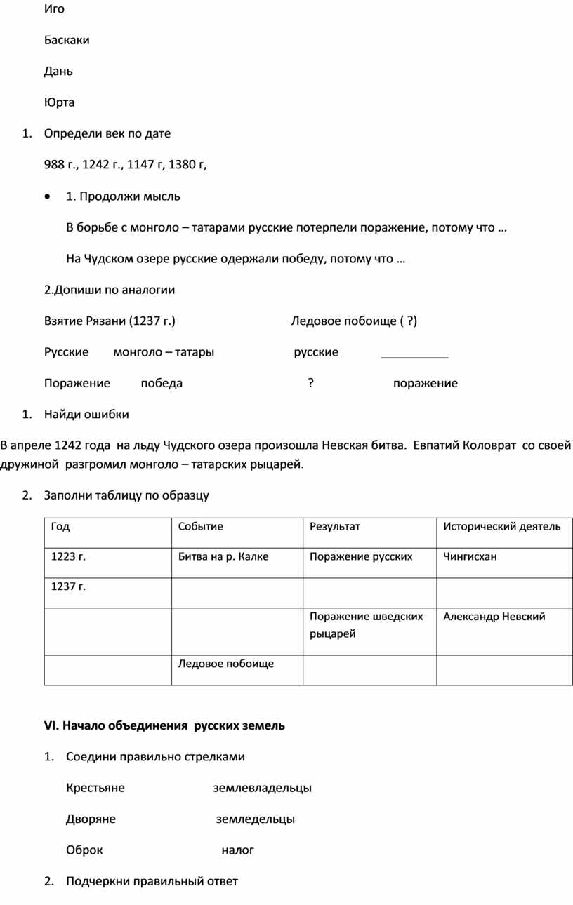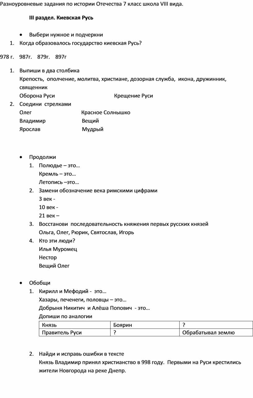 Разноуровневые задания по истории Отечества 7 класс школа VIII вида.
