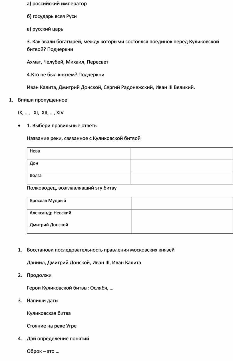 3. Как звали богатырей, между которыми состоялся поединок перед Куликовской битвой? Подчеркни