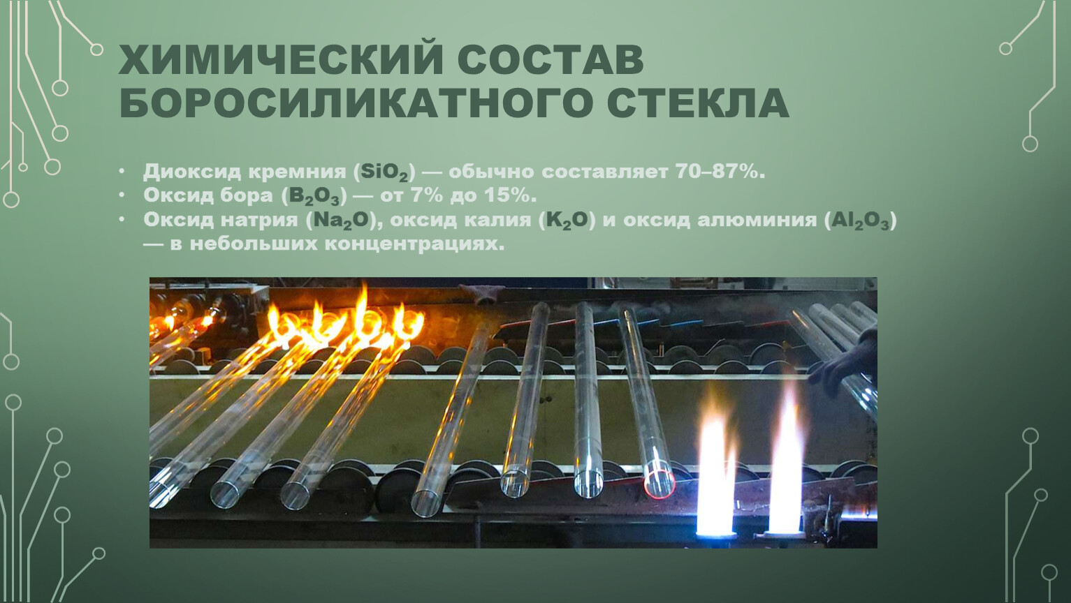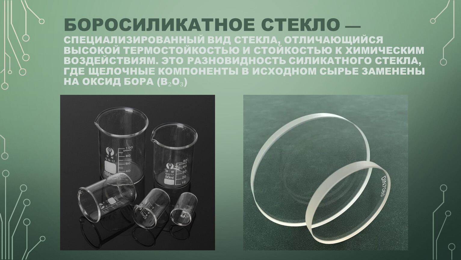 Боросиликатное стекло — специализированный вид стекла, отличающийся высокой термостойкостью и стойкостью к химическим воздействиям. Это разновидность силикатного стекла, где щелочные компоненты в исходном сырье заменены на оксид бора (B₂O₃)