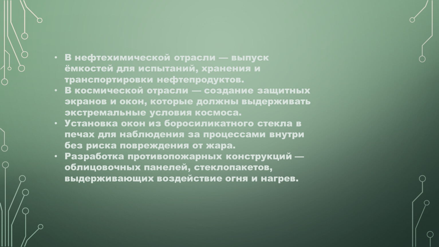 В космической отрасли — создание защитных экранов и окон, которые должны выдерживать экстремальные условия космоса.