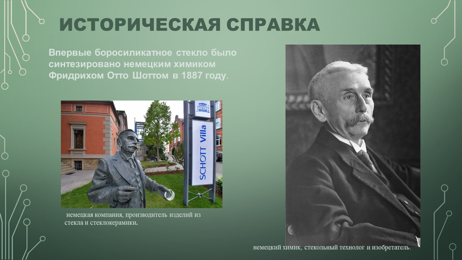 Впервые боросиликатное стекло было синтезировано немецким химиком Фридрихом Отто Шоттом в 1887 году.