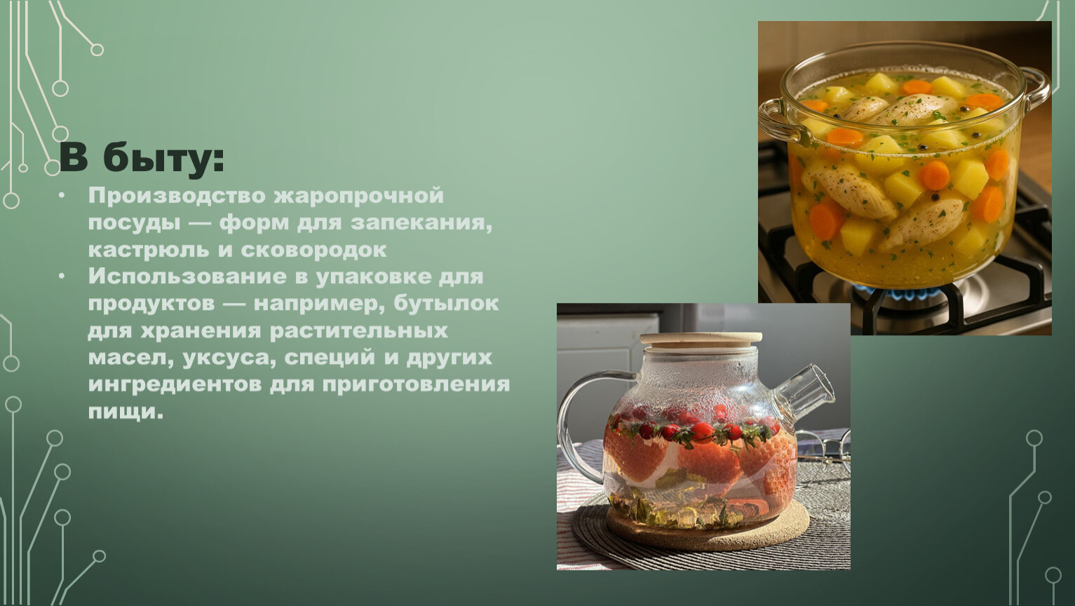 Использование в упаковке для продуктов — например, бутылок для хранения растительных масел, уксуса, специй и других ингредиентов для приготовления пищи.