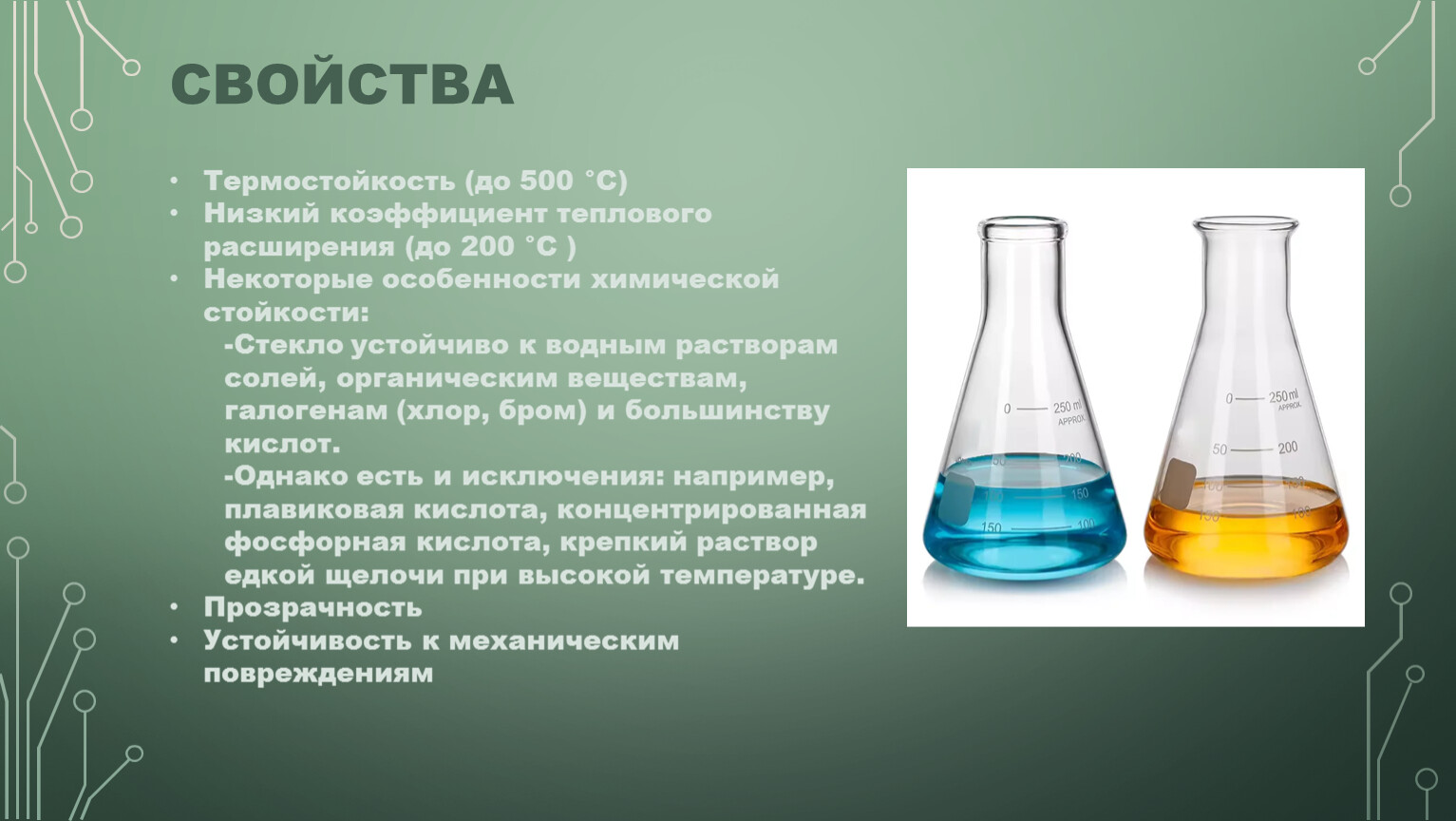 -Стекло устойчиво к водным растворам солей, органическим веществам, галогенам (хлор, бром) и большинству кислот.