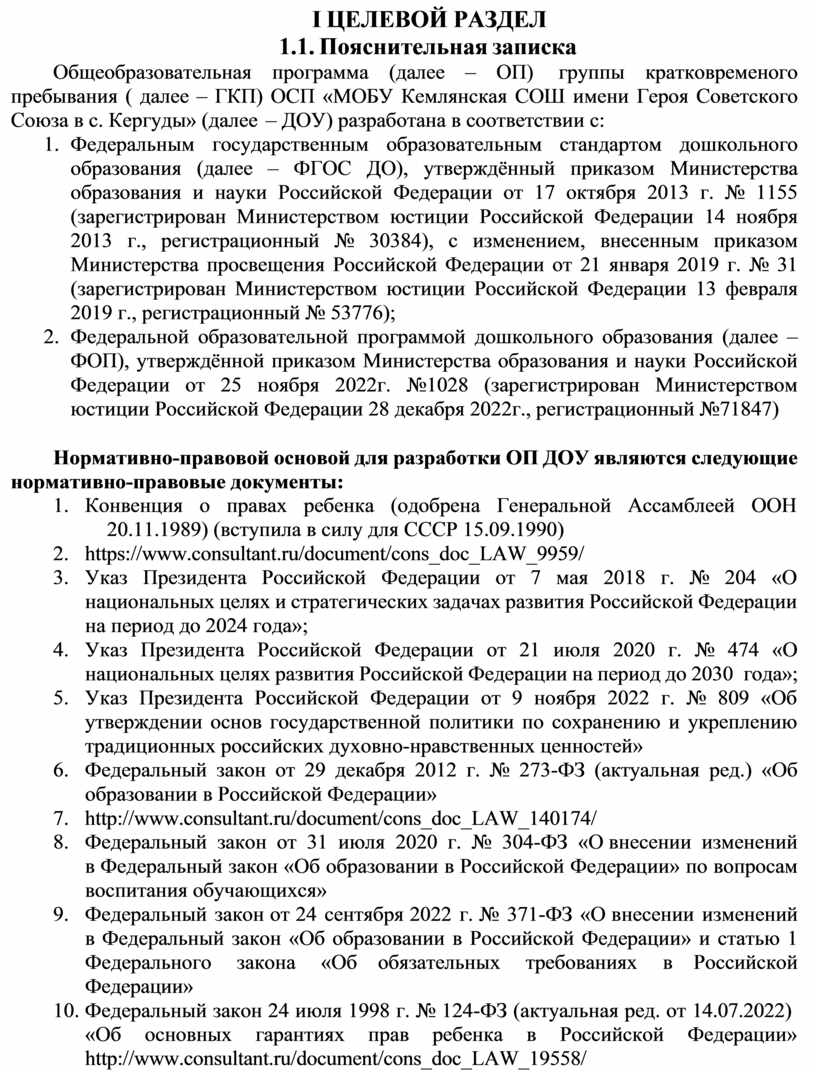 Общеобразовательная программа (далее – ОП) группы кратковременого пребывания ( далее – ГКП) ОСП «МОБУ Кемлянская СОШ имени Героя Советского Союза в с. Кергуды» (далее – ДОУ) разработана в соответствии с: