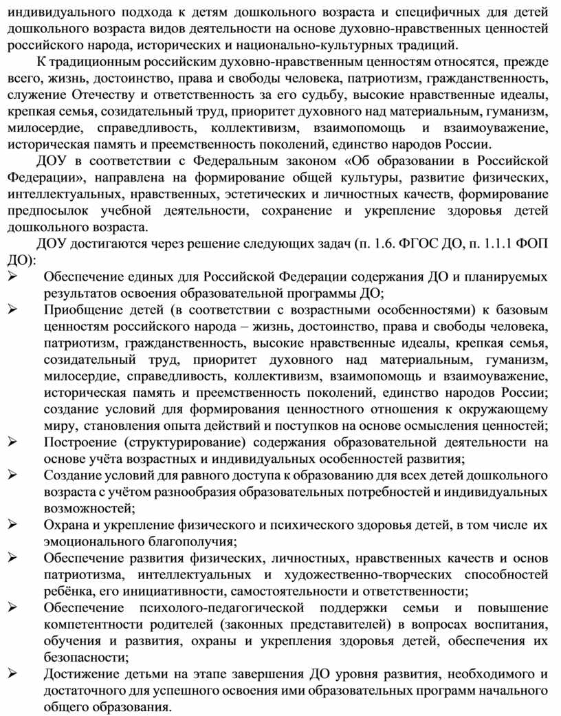 индивидуального подхода к детям дошкольного возраста и специфичных для детей дошкольного возраста видов деятельности на основе духовно-нравственных ценностей российского народа, исторических и национально-культурных традиций.