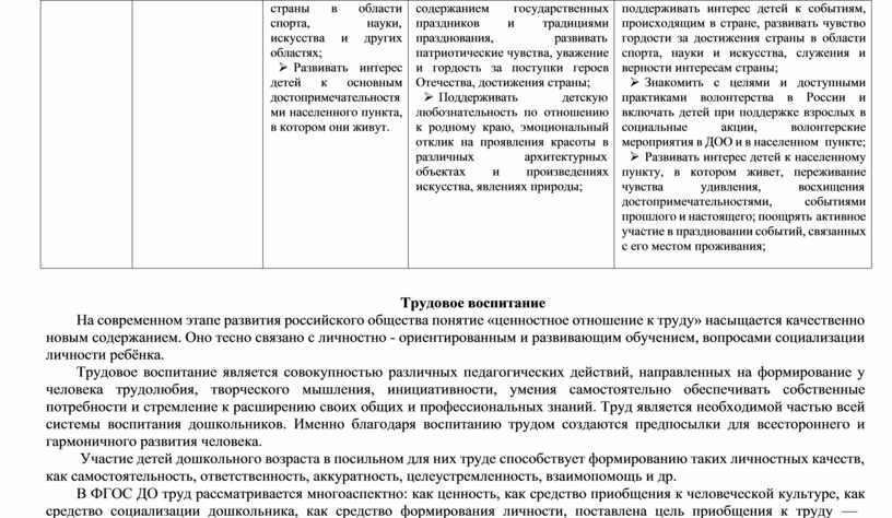Ø Приобщение детей (в соответствии с возрастными особенностями) к базовым ценностям российского народа – жизнь, достоинство, права и свободы человека, патриотизм, гражданственность, высокие нравственные идеалы, крепкая семья, созидательный труд, приоритет духовного над материальным, гуманизм, милосердие, справедливость, коллективизм, взаимопомощь и взаимоуважение, историческая память и преемственность поколений, единство народов России; создание условий для формирования ценностного отношения к окружающему миру, становления опыта действий и поступков на основе осмысления ценностей;