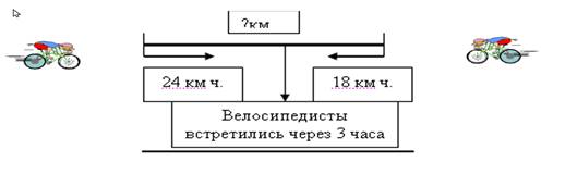 Из двух сел одновременно выехали навстречу 2 велосипедиста. Скорость одного из них 24 км/ч, а другого – 18 км/ч. Найдите расстояние между селами, если велосипедисты встретились через три часа.