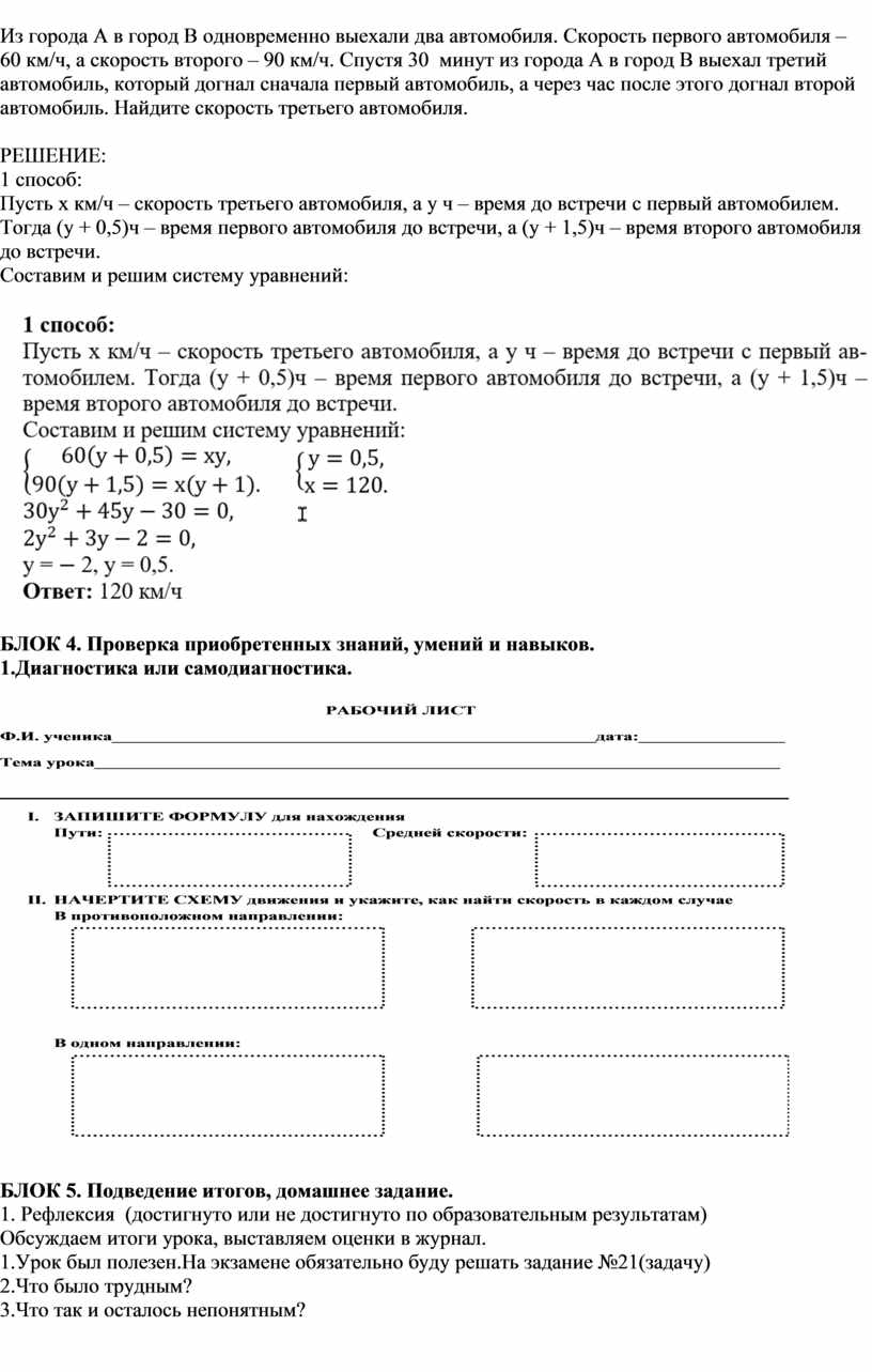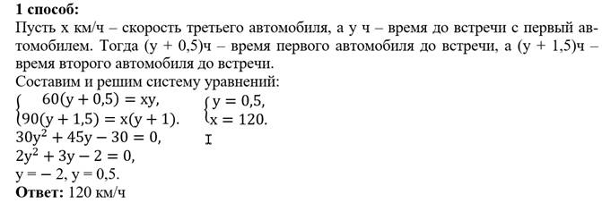 Пусть х км/ч – скорость третьего автомобиля, а у ч – время до встречи с первый автомобилем. Тогда (у + 0,5)ч – время первого автомобиля до встречи, а (у + 1,5)ч – время второго автомобиля до встречи.