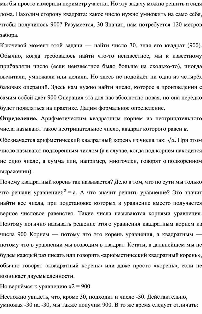 Ключевой момент этой задачи — найти число 30, зная его квадрат (900). Обычно, когда требовалось найти что-то неизвестное, мы к известному прибавляли число (если неизвестное было больше на сколько-то), иногда вычитали, умножали или делили. Но здесь не подойдёт ни одна из четырёх базовых операций. Здесь нам нужно найти число, которое в произведении с самим собой даёт 900 Операция эта для нас абсолютно новая, но она нередко будет появляться на практике. Дадим формальное определение.