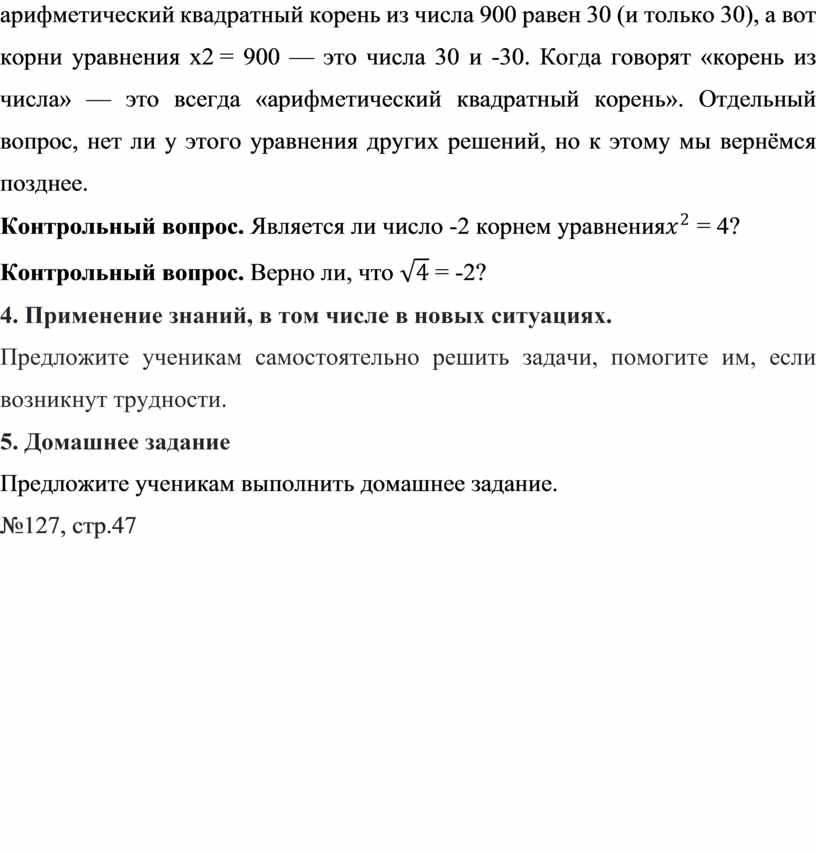 Несложно увидеть, что, кроме 30, подходит и число -30. Действительно, умножая -30 на -30, мы также получим 900. В то же время следует отличать: арифметический квадратный корень из числа 900 равен 30 (и только 30), а вот корни уравнения x2 = 900 — это числа 30 и -30. Когда говорят «корень из числа» — это всегда «арифметический квадратный корень». Отдельный вопрос, нет ли у этого уравнения других решений, но к этому мы вернёмся позднее.