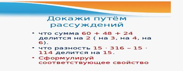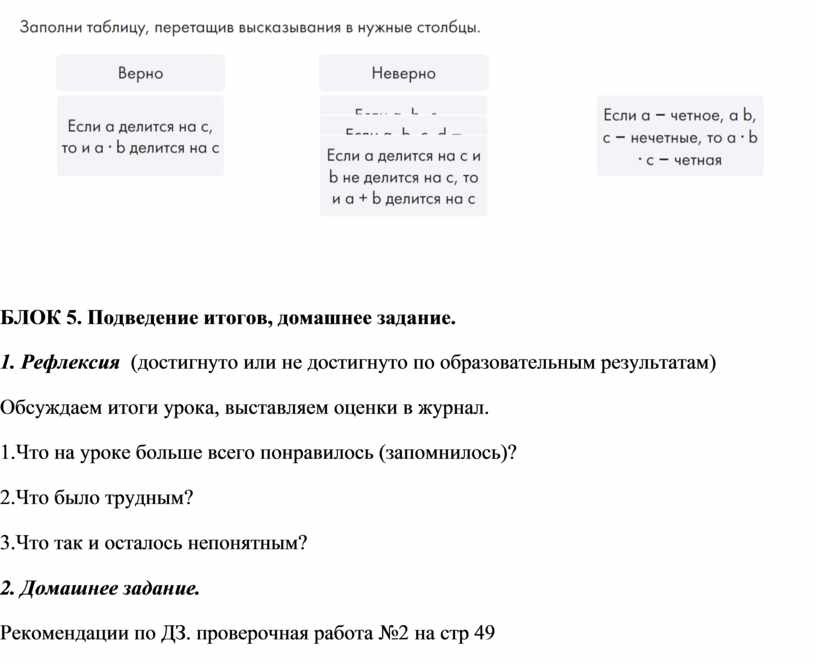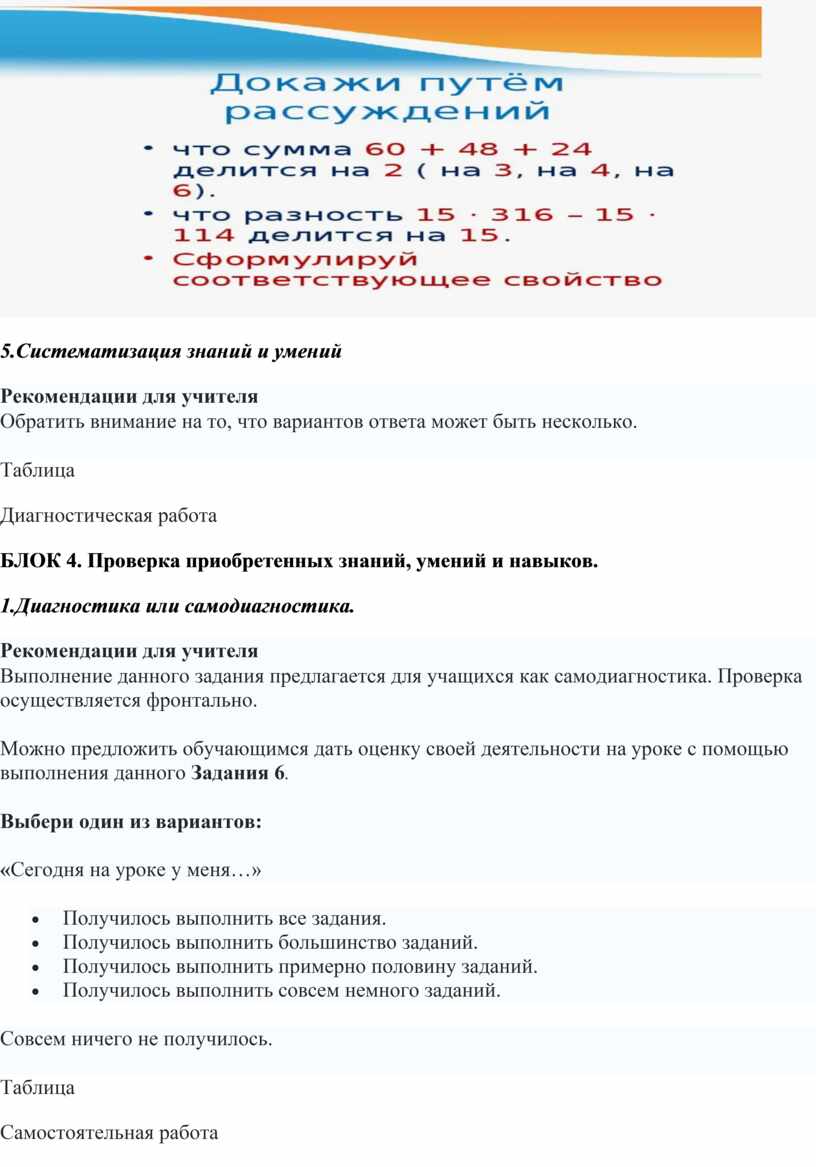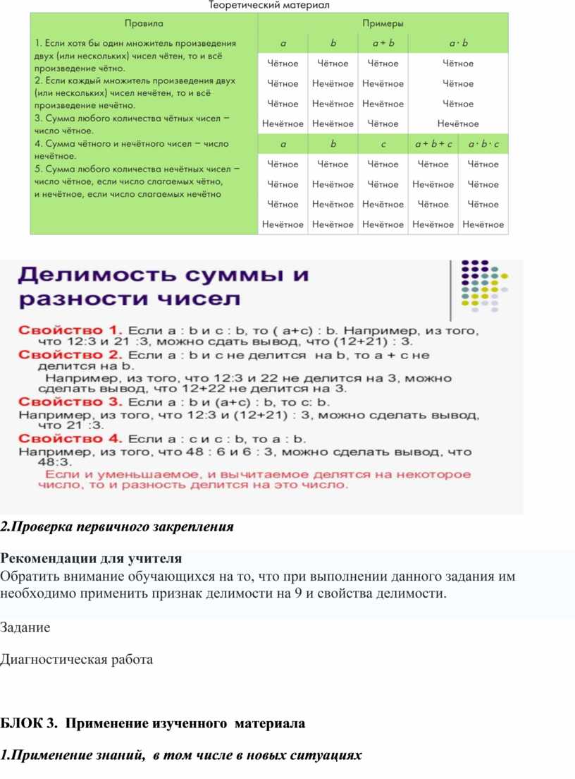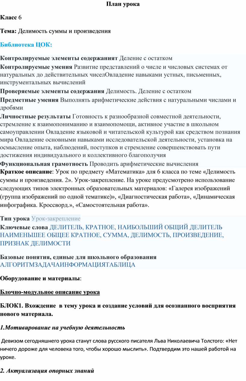 Краткое описание: Урок по предмету «Математика» для 6 класса по теме «Делимость суммы и произведения. 2». Урок-закрепление. На уроке предусмотрено использование следующих типов электронных образовательных материалов: «Галерея изображений (группа изображений по одной тематике)», «Диагностическая работа», «Динамическая инфографика. Кроссворд.», «Самостоятельная работа».