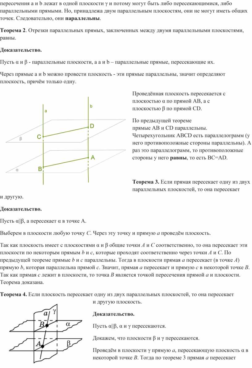 Прямая c принадлежит плоскости α, значит хотя бы одна из прямых a1 или a2 пересекает прямую c, то есть имеет с ней общую точку. Но прямая c также принадлежит и плоскости β, значит, пересекая прямую c, прямая a1 или a2 пересекает плоскость β, чего быть не может, так как прямые a1 и a2 параллельны плоскости β. Из этого следует, что плоскости α и β не пересекаются, то есть они параллельны. Теорема доказана. Свойства параллельных плоскостей. Теорема 1. Если две параллельные плоскости пересекаются третьей, то линии их пересечения параллельны. Доказательство. Пусть α и β - параллельные плоскости, а γ- плоскость, пересекающая их. Плоскость α пересекается с плоскостью γ по прямой a.
