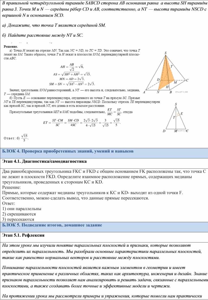 Планируемые результаты:определять, являются ли две плоскости параллельными, используя признаки параллельности; применять полученные знания для решения задач, связанных с параллельными плоскостями; объяснять основные концепции и признаки параллельных плоскостей с использованием правильных терминов и определений. |