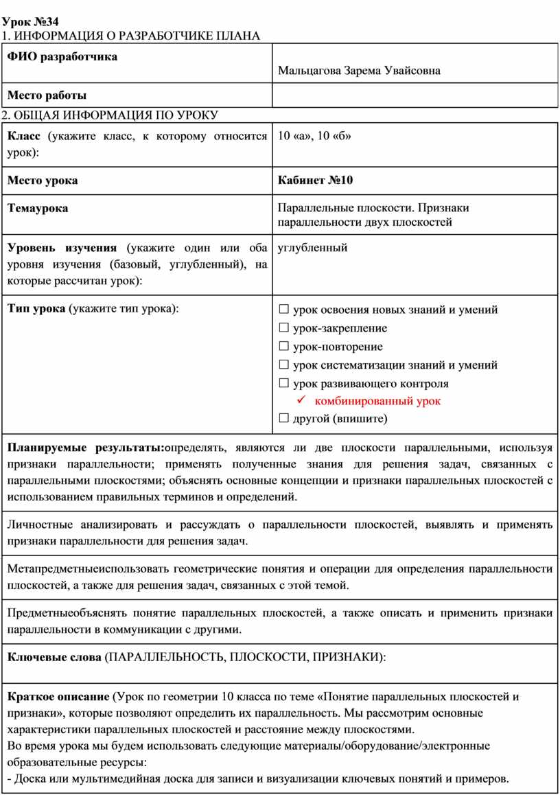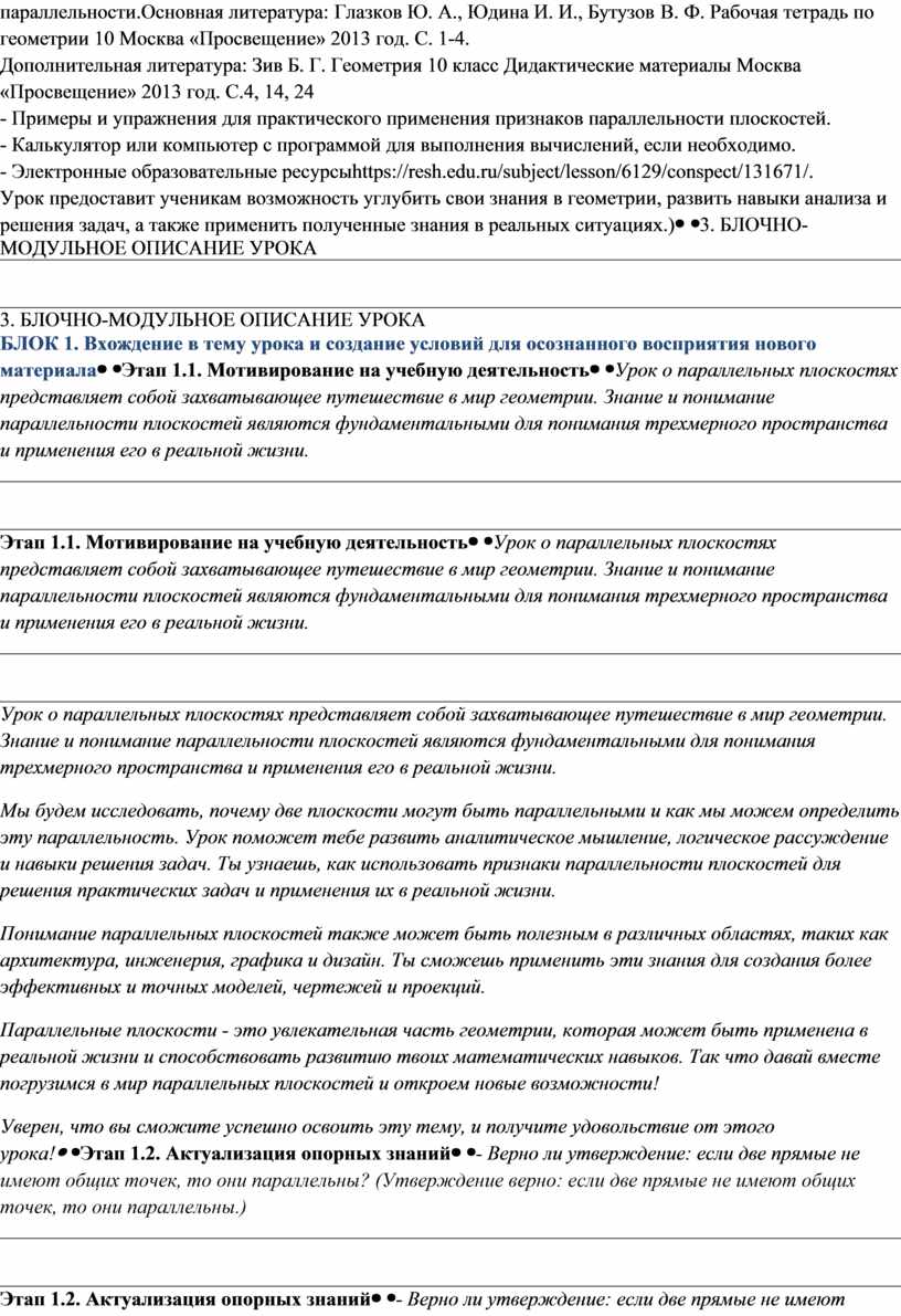 Метапредметныеиспользовать геометрические понятия и операции для определения параллельности плоскостей, а также для решения задач, связанных с этой темой. |