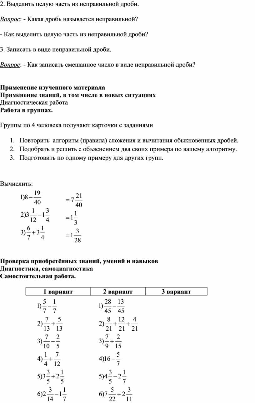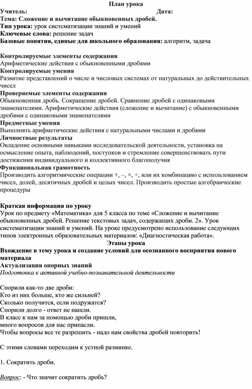 Урок по предмету «Математика» для 5 класса по теме «Сложение и вычитание обыкновенных дробей. Решение текстовых задач, содержащих дроби. 2». Урок систематизации знаний и умений. На уроке предусмотрено использование следующих типов электронных образовательных материалов: «Диагностическая работа».