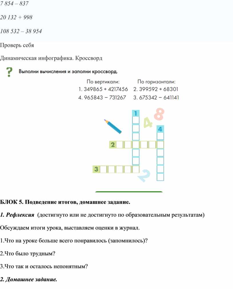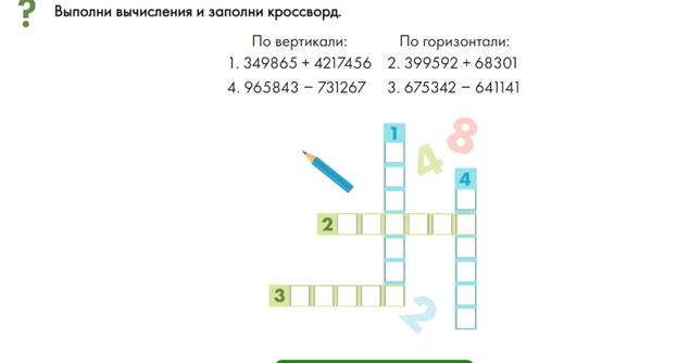 На очном уроке Кроссворд можно распечатать и дать детям заполнить. Можно вывести на доску и заполнять всем классом вместе таким образом: когда все сделают 1 пример, один ребенок вписывает свой ответ, все проверяют. Если нет ошибок, переходят ко второму и так далее.