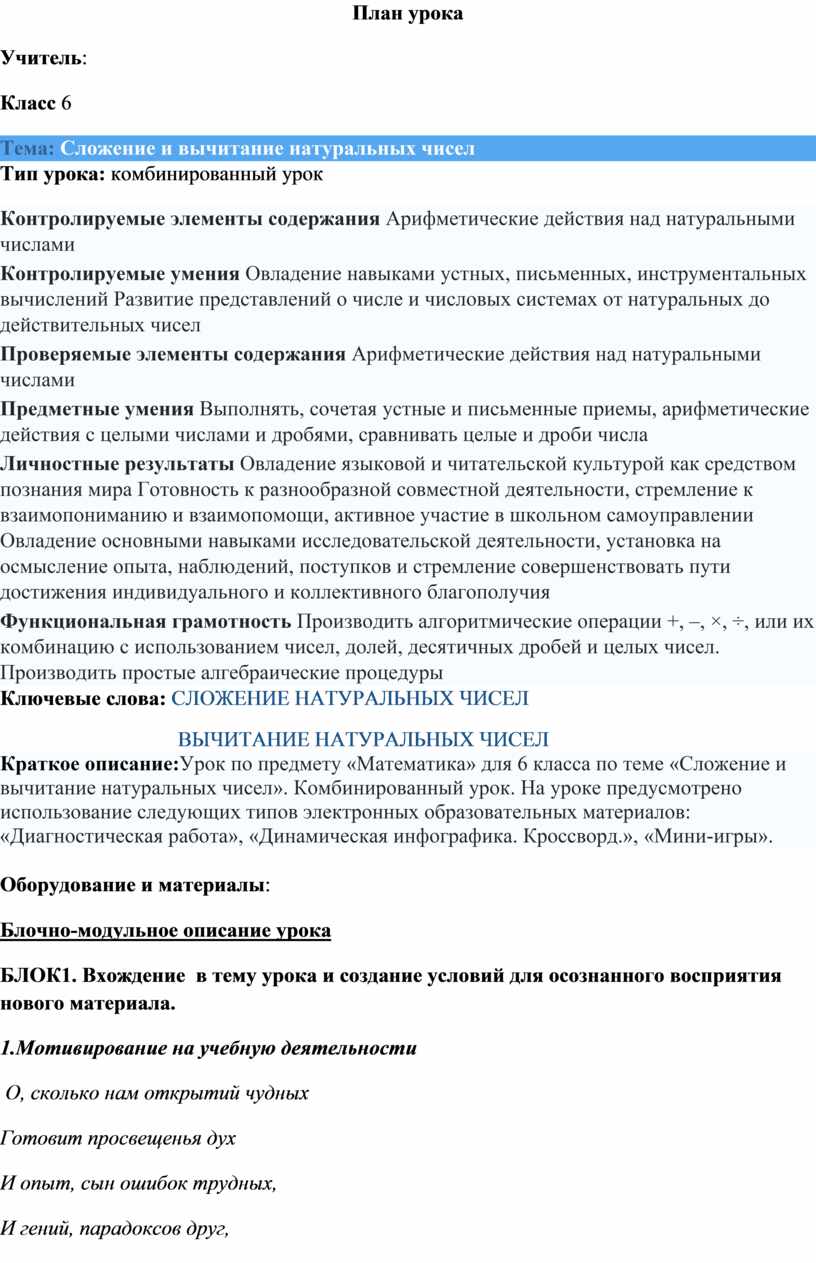 Ключевые слова: СЛОЖЕНИЕ НАТУРАЛЬНЫХ ЧИСЕЛ