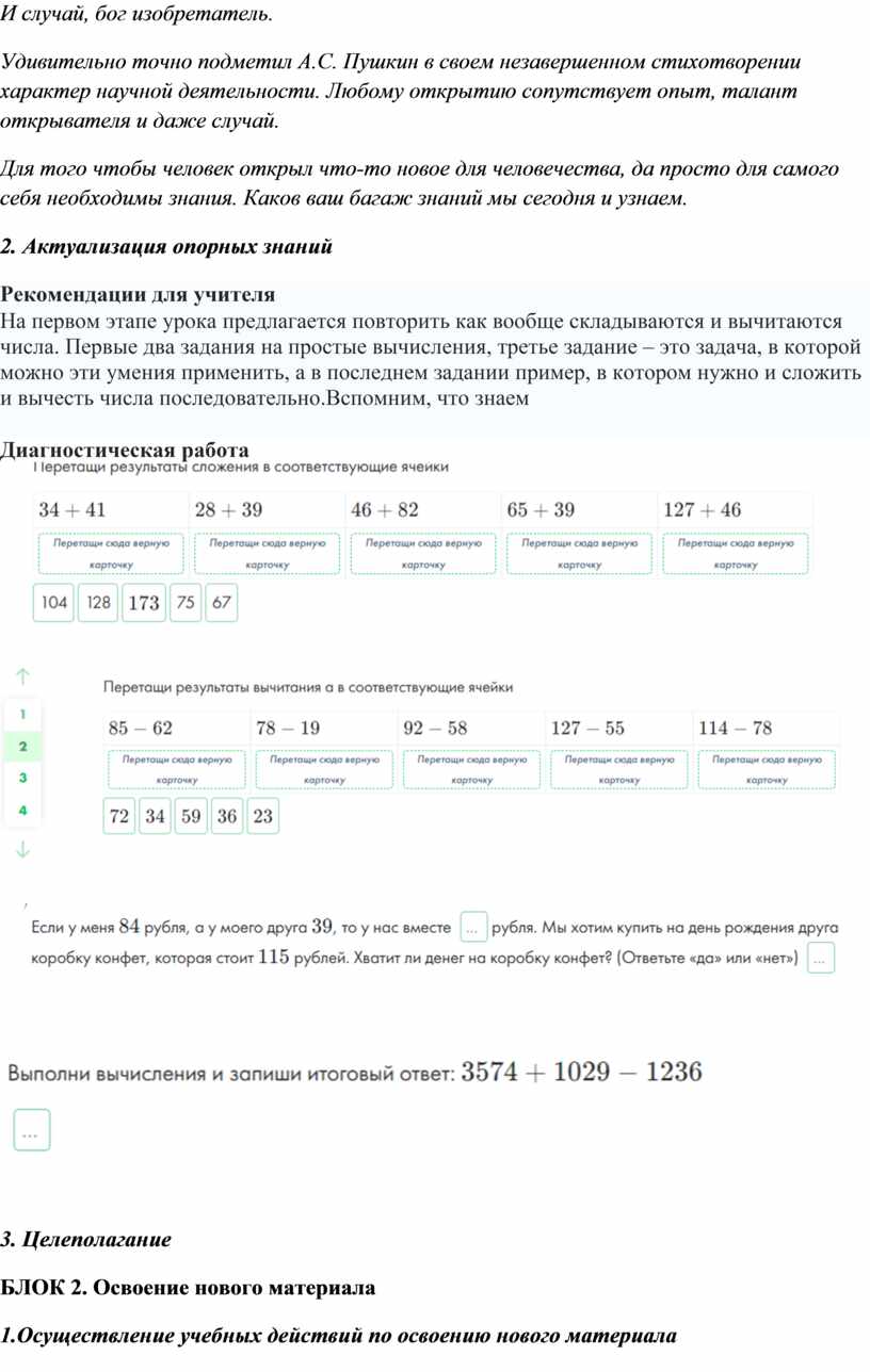 На первом этапе урока предлагается повторить как вообще складываются и вычитаются числа. Первые два задания на простые вычисления, третье задание – это задача, в которой можно эти умения применить, а в последнем задании пример, в котором нужно и сложить и вычесть числа последовательно.Вспомним, что знаем
