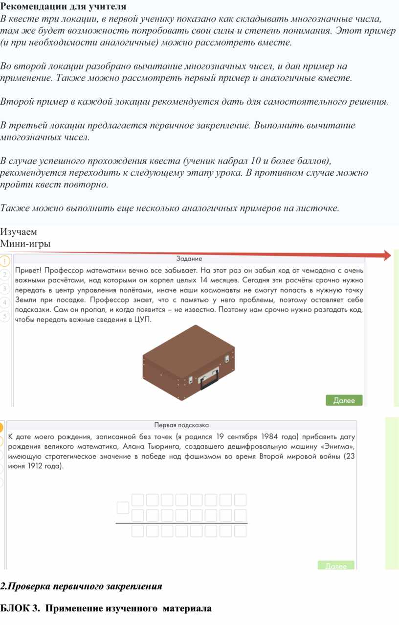 В квесте три локации, в первой ученику показано как складывать многозначные числа, там же будет возможность попробовать свои силы и степень понимания. Этот пример (и при необходимости аналогичные) можно рассмотреть вместе.