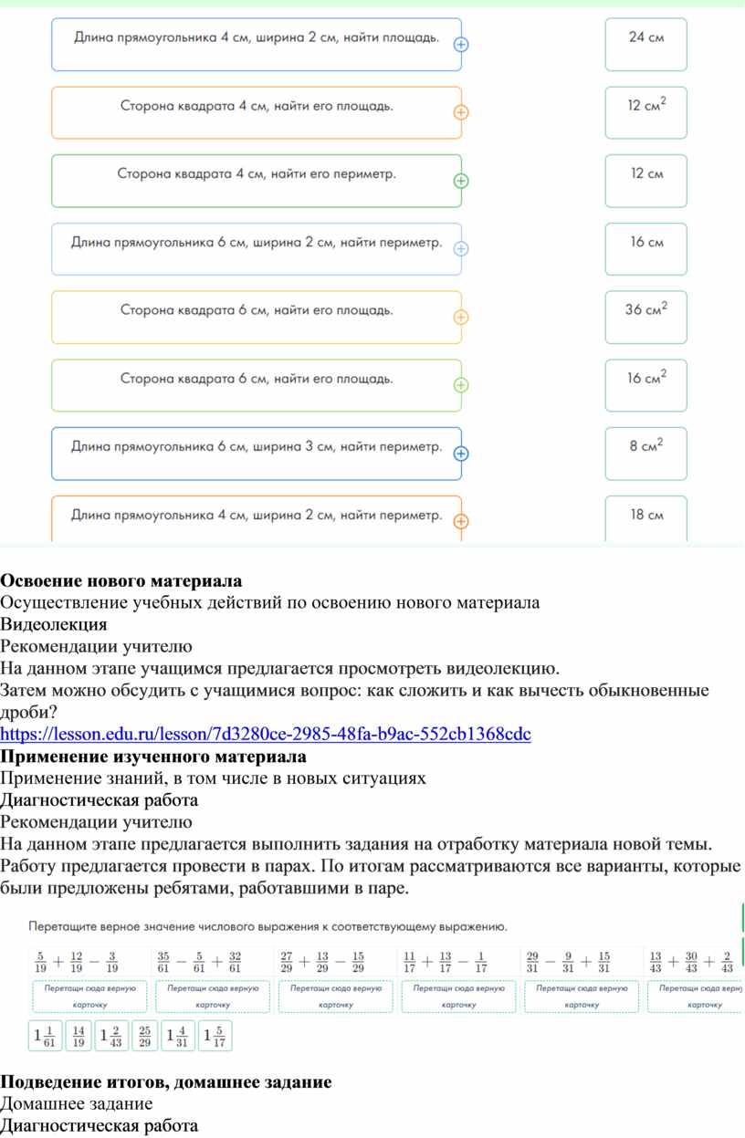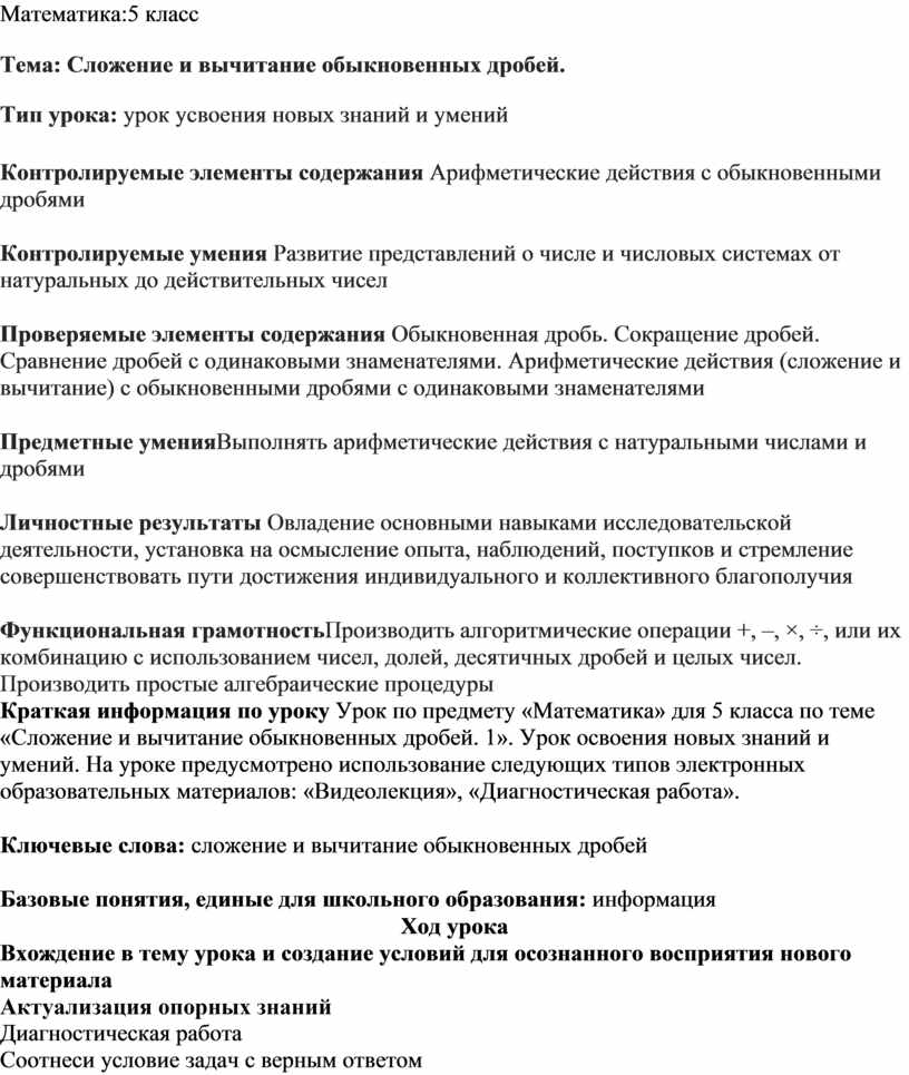 Краткая информация по уроку Урок по предмету «Математика» для 5 класса по теме «Сложение и вычитание обыкновенных дробей. 1». Урок освоения новых знаний и умений. На уроке предусмотрено использование следующих типов электронных образовательных материалов: «Видеолекция», «Диагностическая работа».
