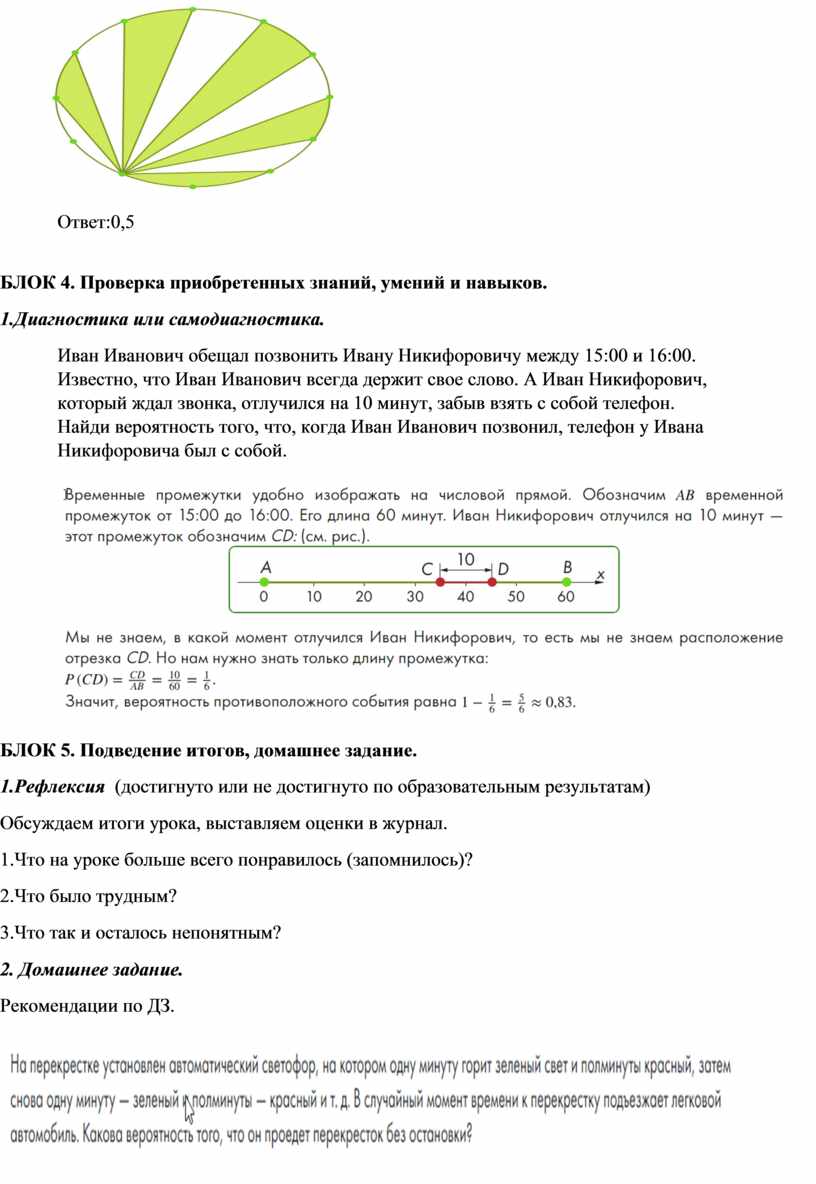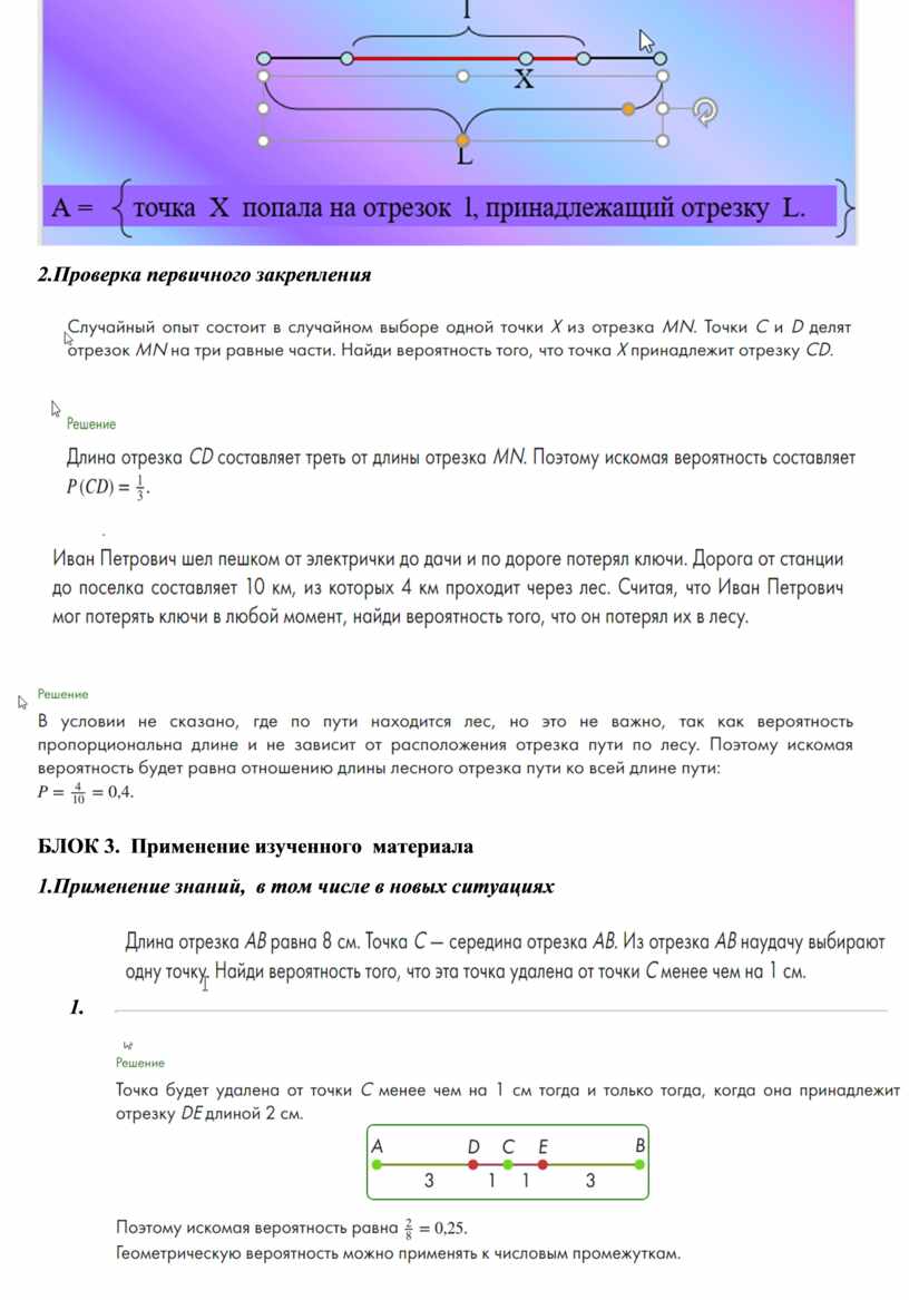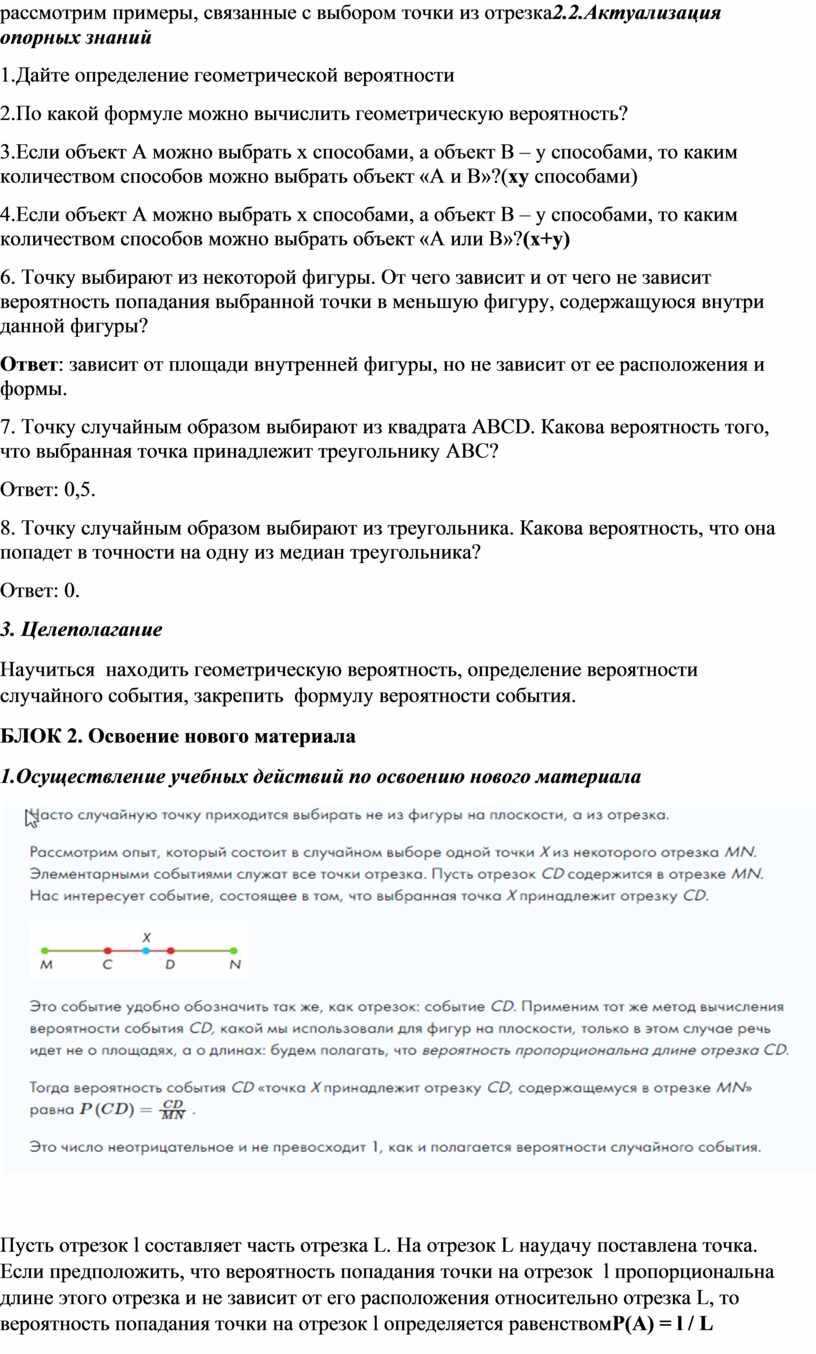 На прошлом уроке мы познакомились с геометрической вероятностью на примере опытов, связанных с выбором точки из фигуры на плоскости. На этом уроке мы рассмотрим примеры, связанные с выбором точки из отрезка2.2.Актуализация опорных знаний