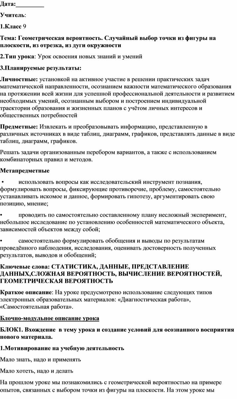 Ключевые слова: СТАТИСТИКА, ДАННЫЕ, ПРЕДСТАВЛЕНИЕ ДАННЫХ,СЛОЖНАЯ ВЕРОЯТНОСТЬ, ВЫЧИСЛЕНИЕ ВЕРОЯТНОСТЕЙ, ГЕОМЕТРИЧЕСКАЯ ВЕРОЯТНОСТЬ