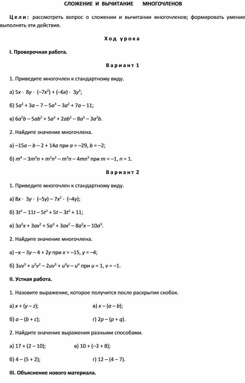 Цели: рассмотреть вопрос о сложении и вычитании многочленов; формировать умение выполнять эти действия.
