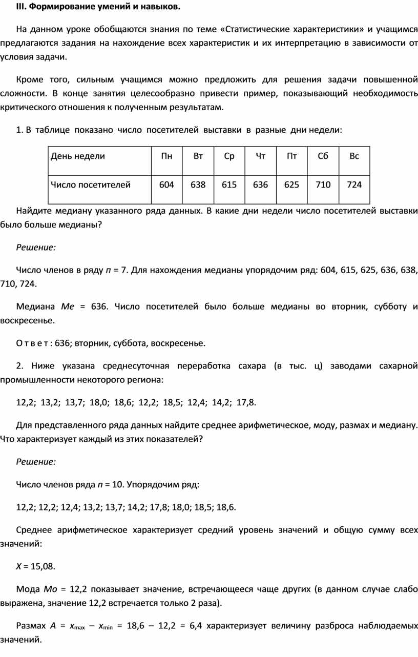 Медиана Ме = 636. Число посетителей было больше медианы во вторник, субботу и воскресенье.