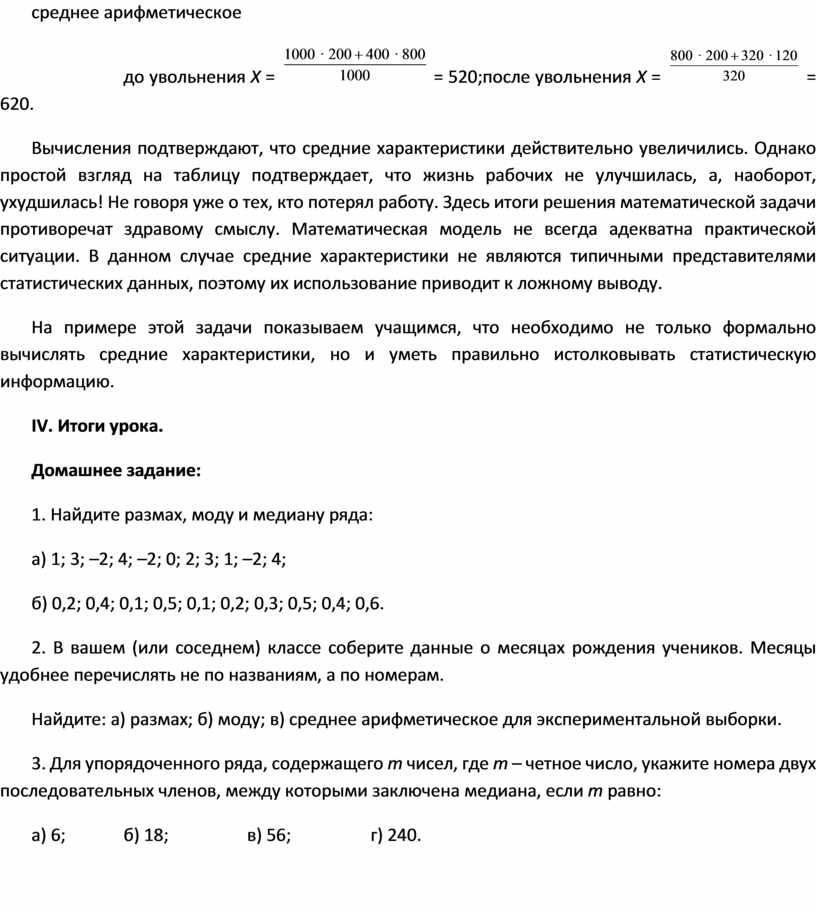Вычисления подтверждают, что средние характеристики действительно увеличились. Однако простой взгляд на таблицу подтверждает, что жизнь рабочих не улучшилась, а, наоборот, ухудшилась! Не говоря уже о тех, кто потерял работу. Здесь итоги решения математической задачи противоречат здравому смыслу. Математическая модель не всегда адекватна практической ситуации. В данном случае средние характеристики не являются типичными представителями статистических данных, поэтому их использование приводит к ложному выводу.