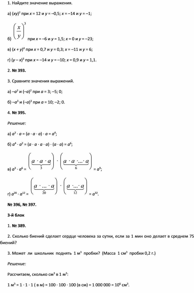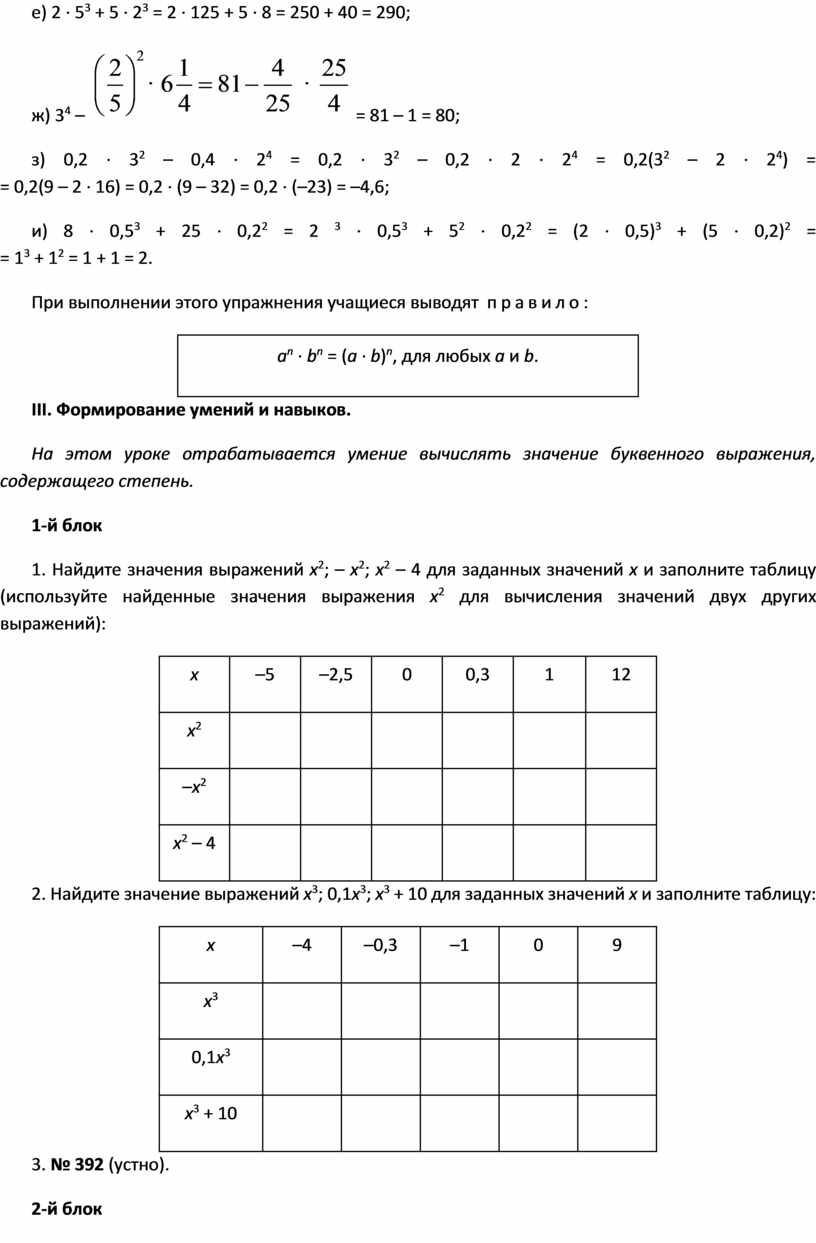 – Каков порядок действий при нахождении числового и буквенного выражения, содержащего степень?
