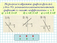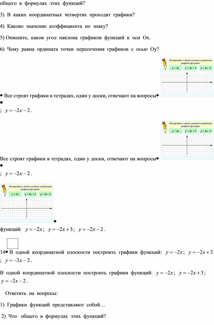 Ответить на вопросы: 1) Графики функций представляют собой… 2) Что общего в формулах этих функций? 3) В каких координатных четвертях расположены графики? 4) Каково значение коэффициента по знаку? 5) Опишите, каков угол наклона графиков функций к оси Ох. 6) Чему равнардината точки пересечения графиков с осью Оу?