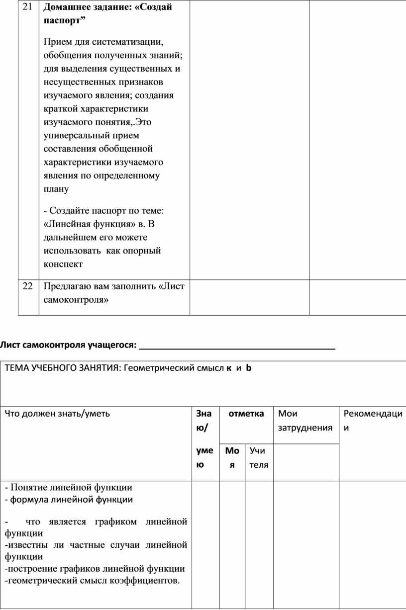 Домашнее задание: «Создай паспорт” Прием для систематизации, обобщения полученных знаний; для выделения существенных и несущественных признаков изучаемого явления; создания краткой характеристики изучаемого понятия,.Это универсальный прием составления обобщенной характеристики изучаемого явления по определенному плану - Создайте паспорт по теме: «Линейная функция» в. В дальнейшем его можете использовать как опорный конспект |