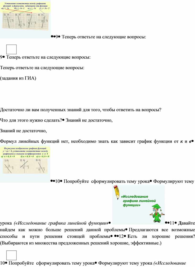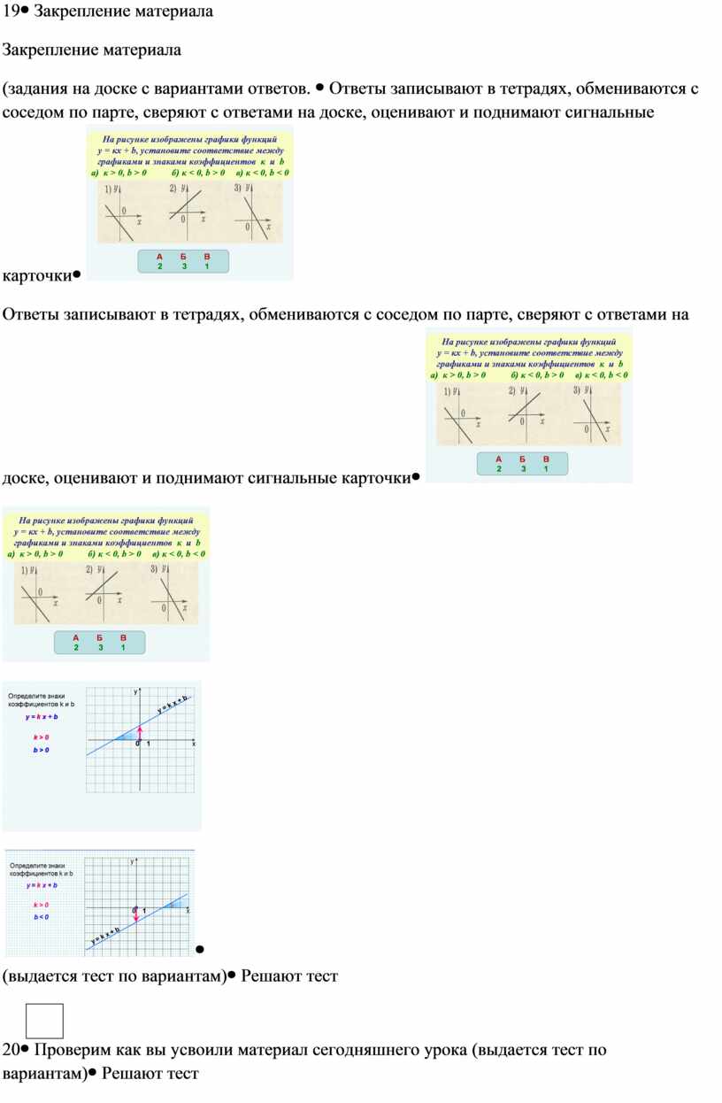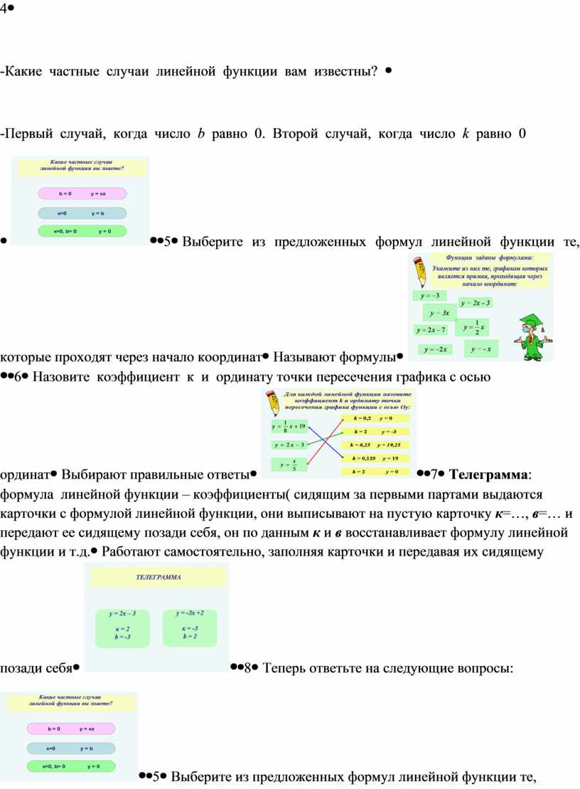 Телеграмма: формула линейной функции – коэффициенты( сидящим за первыми партами выдаются карточки с формулой линейной функции, они выписывают на пустую карточку к=…, в=… и передают ее сидящему позади себя, он по данным к и в восстанавливает формулу линейной функции и т.д. |