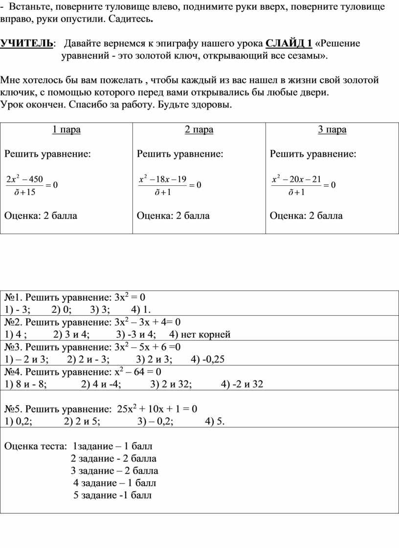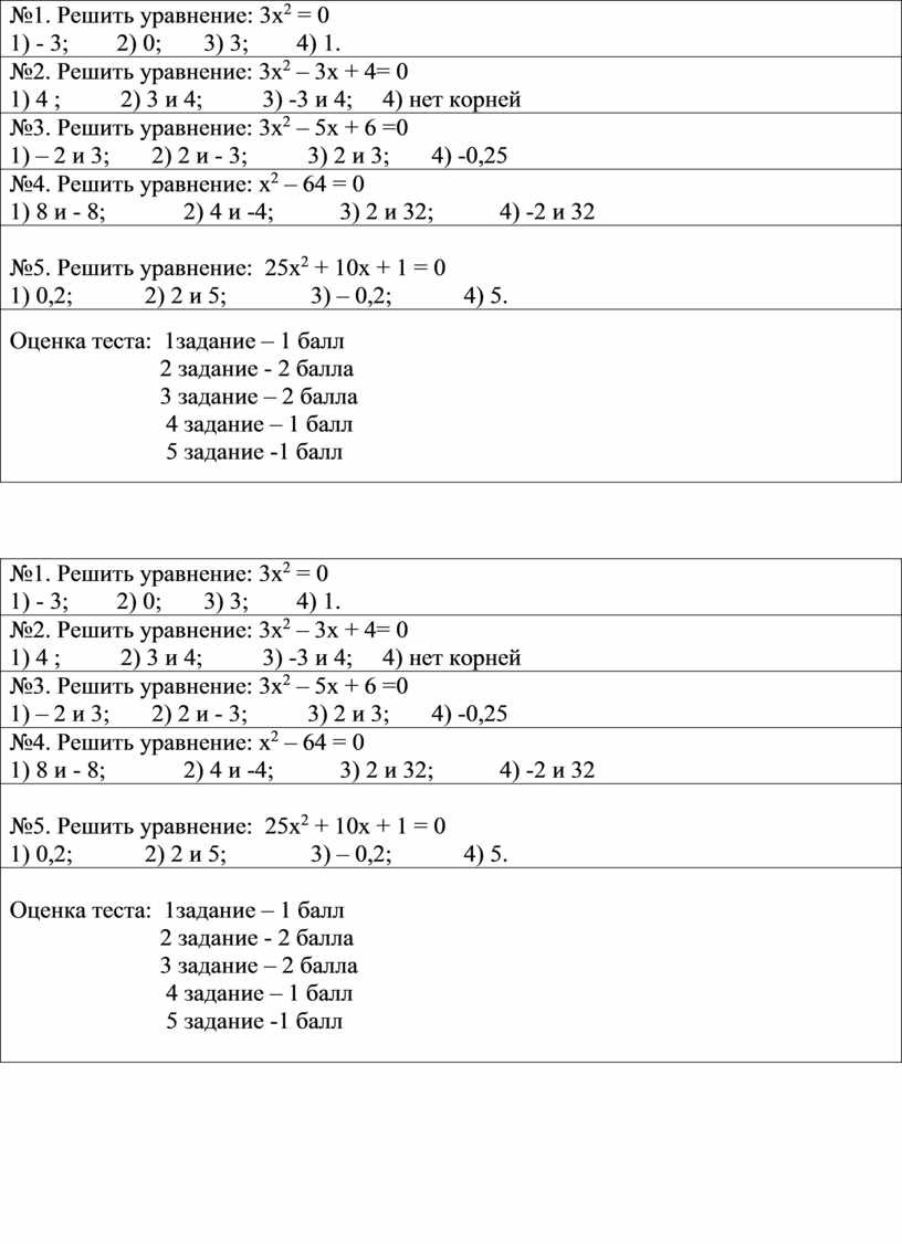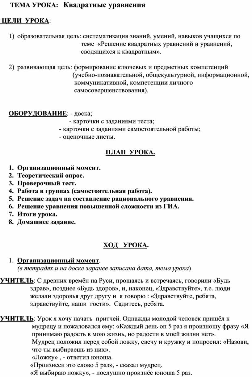 квадратных уравнений, выполнив задания теста в течение 10 мин.