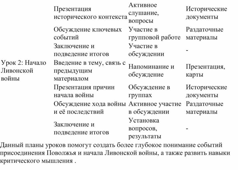 Данный планы уроков помогут создать более глубокое понимание событий присоединения Поволжья и начала Ливонской войны, а также развить навыки критического мышления .