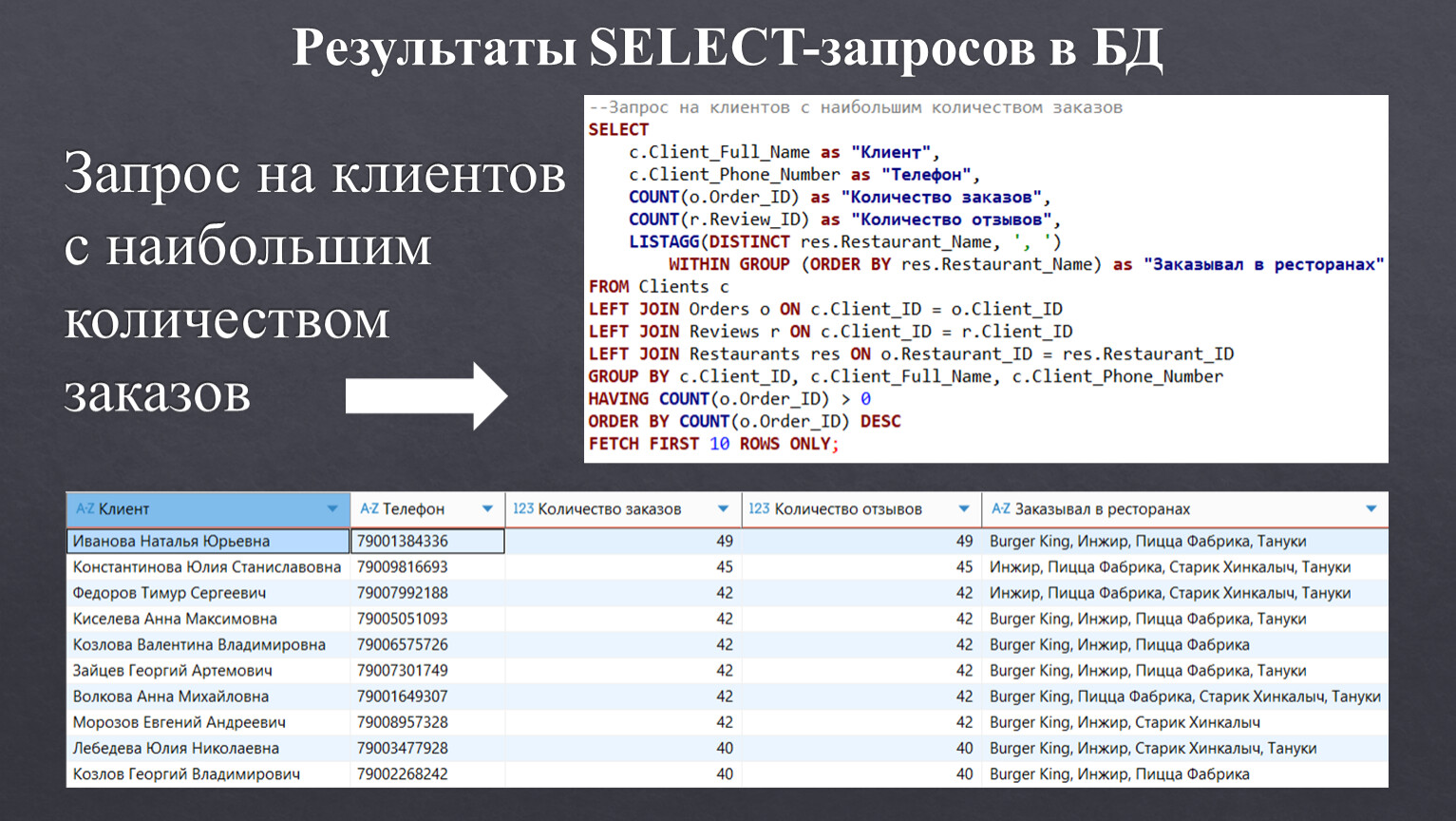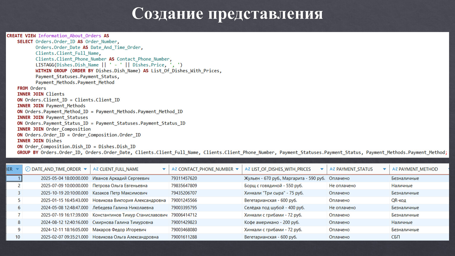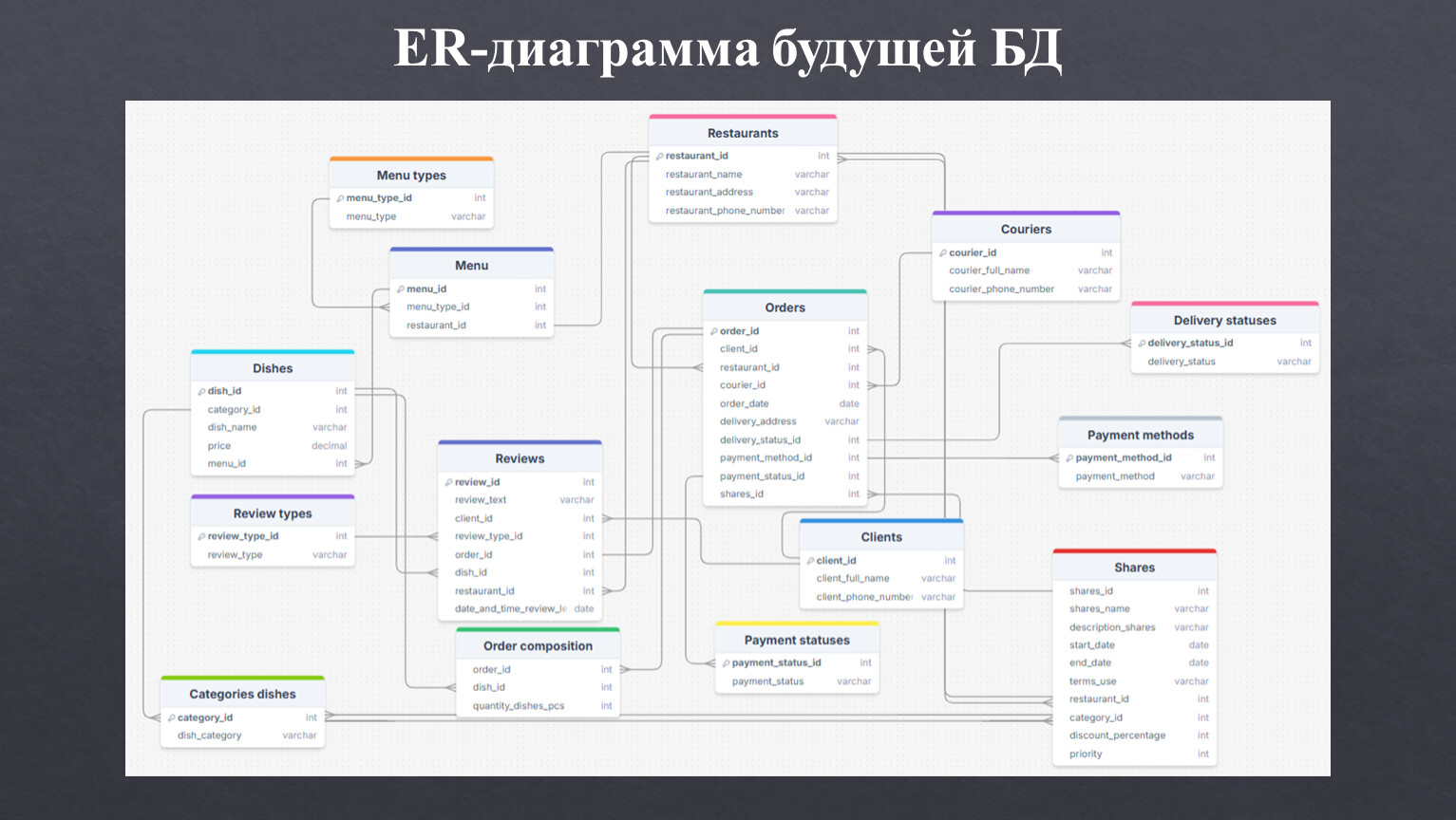 Созданы таблицы, представление и запросы, позволяющие эффективно управлять заказами, клиентами, меню и доставкой.
